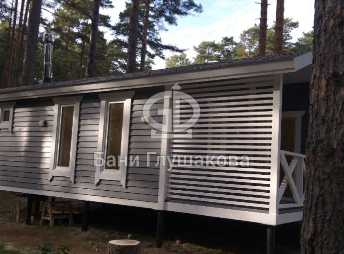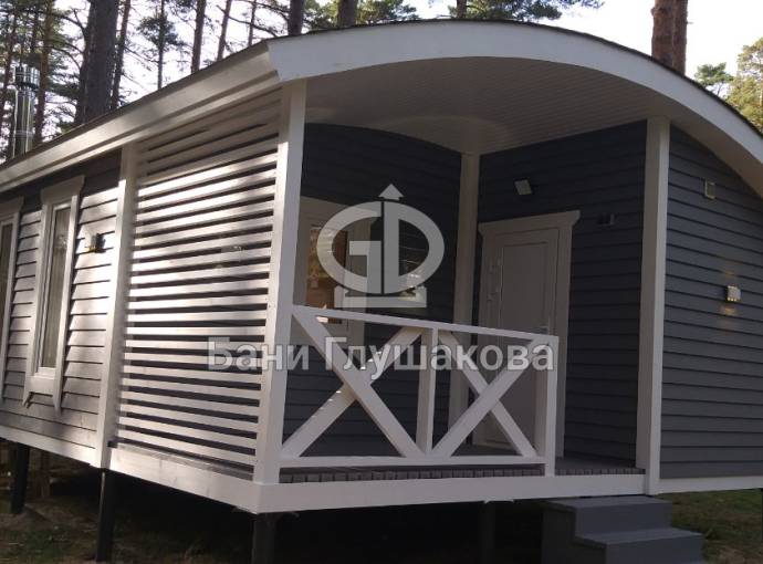 Размер бани — 5,3 × 8 метров, из которых 3,3 × 2 метра занимает уютная терраса — идеальное место для отдыха после парной или чашки чая на свежем воздухе.