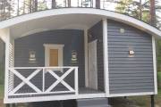 Сухая, строганная, покрашенная и только потом установленная доска внахлест одна на другую, (если это баня «Барн», то обшивается имитацией бруса), если баня «Кубота», то планкеном.