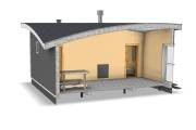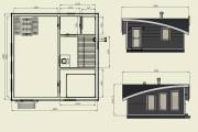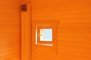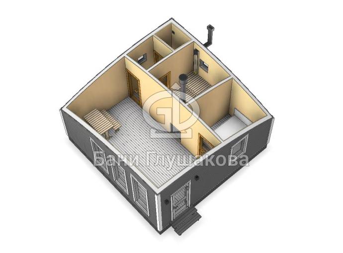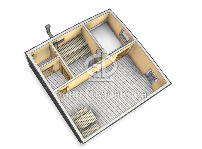 Размер 6х6, площадь 36 квадратов. Внутри 5 помещений: комната отдыха, спальня, парная, душ и санузел. По сути — это полноценный дачный или гостевой дом с сауной. Планировку можно слегка изменить в рамках разумного.