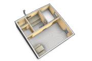 Установлен в помывочном отделении пластиковый герметичный поддон с сифоном для слива воды, в него вложен деревянный трапик (в планировках, где подразумевается душевое помещение). Ссылка на фото и видео