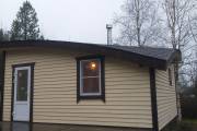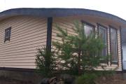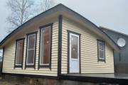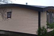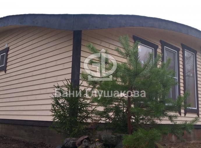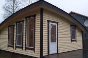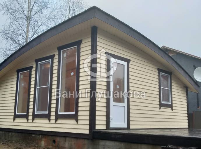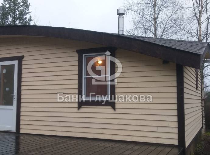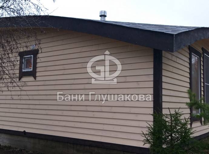 Сухая, строганная, покрашенная и только потом установленная доска внахлест одна на другую, (если это баня «Барн», то обшивается имитацией бруса), если баня «Кубота», то планкеном.