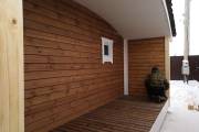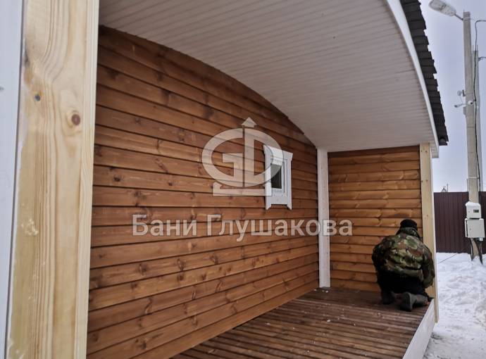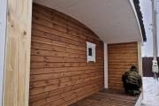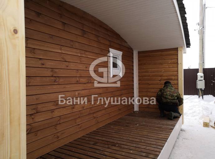 Сухая, строганная, покрашенная и только потом установленная доска внахлест одна на другую, (если это баня «Барн», то обшивается имитацией бруса), если баня «Кубота», то планкеном.