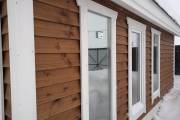 Баня «Бурже» на фото — это полноценный дачный домик на 32 квадратных метра с сауной, душем и жилой комнатой. Планировка была разработана клиентом лично, так что её можно переделать под индивидуальные требования. Например, выделить место под туалет. Со стороны главного фасада сделана узкая терраса — в комплект входит садовая скамейка, которая изготовлена как раз по размерам этой самой террасы. Окна — стеклопакеты, большие панорамные, с добротной фурнитурой. Открываются.