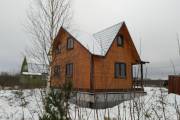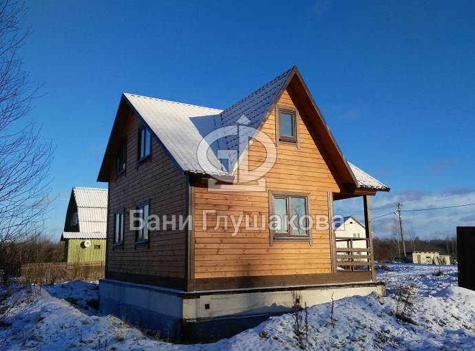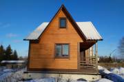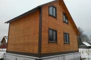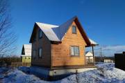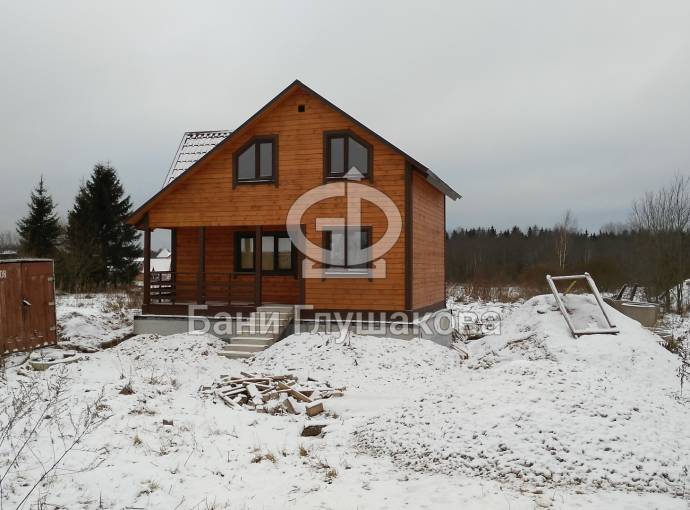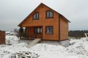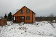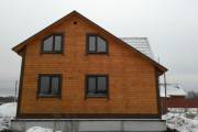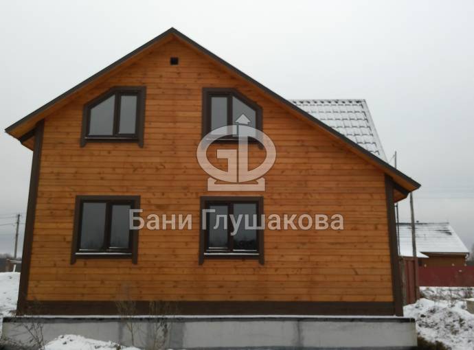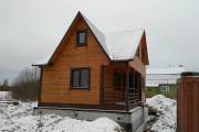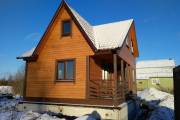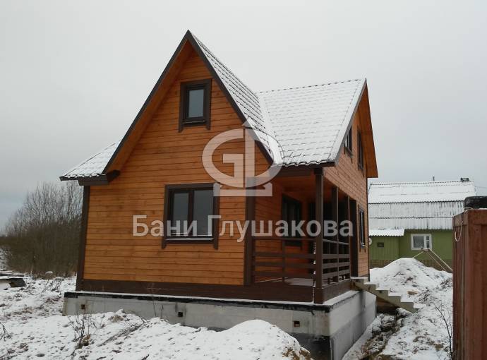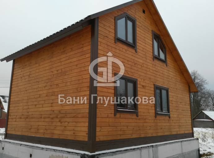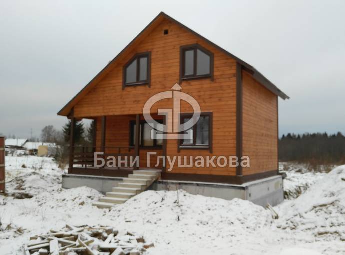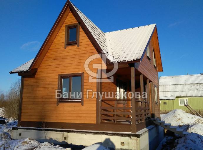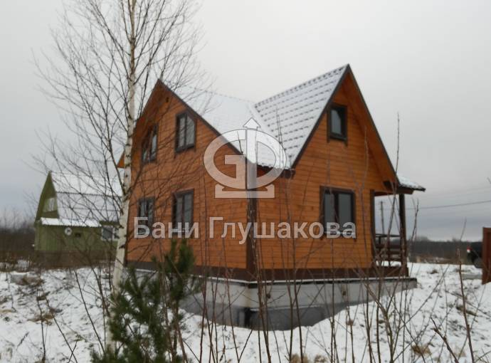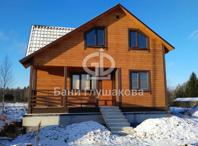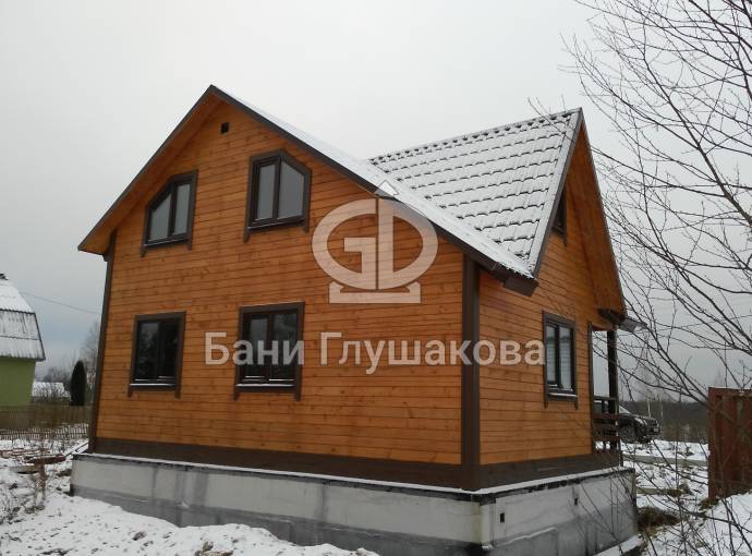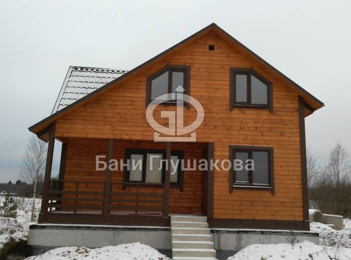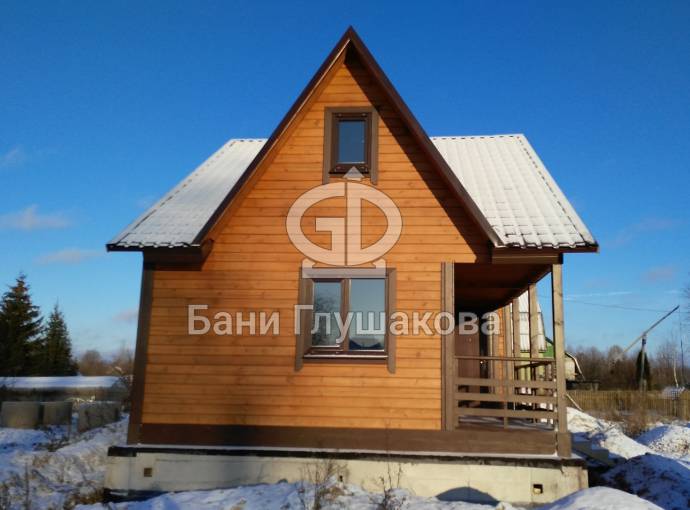 Этот дом был построен из профилированного клееного бруса (ёлка). Проект простой, домик строился под дачу, постоянное проживание не планируется. Делали сразу под ключ, чтобы не растягивать строительство по времени. Фундамент был установлен клиентом заранее.