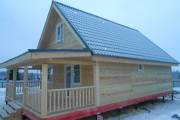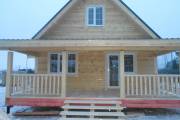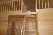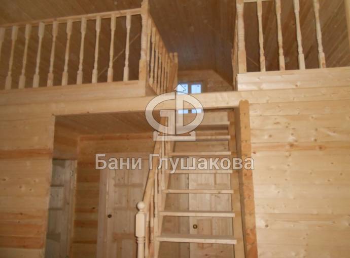 Если объект двухэтажный, то изготавливаем лестницу из строганного бруса. Ступени из специальной клееной доски. Перила настоящие, круглые с точеными балясинами (страница с фото наших работ с лестницами).
