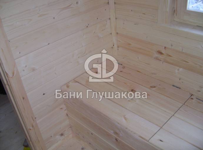 В помывочном отделении сделан душевой поддон на полу, со сливным отверстием, деревянными трапиками