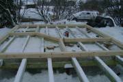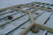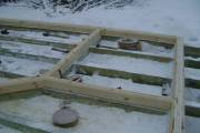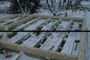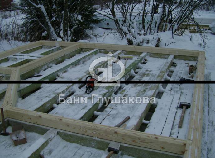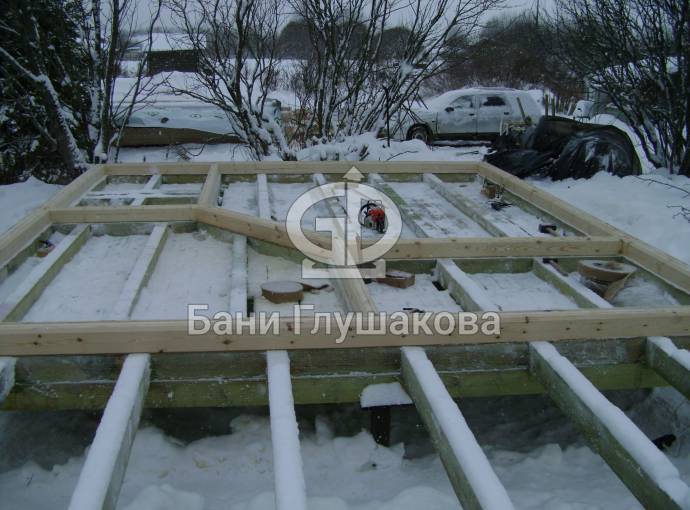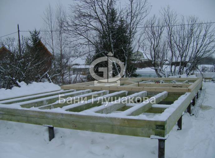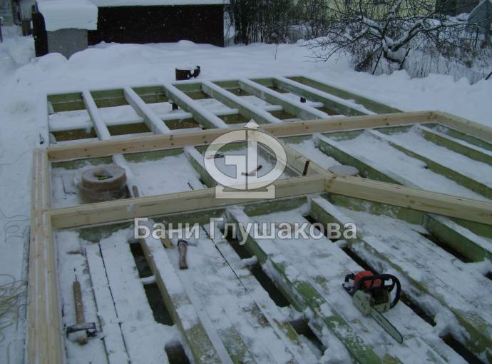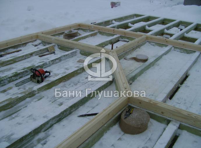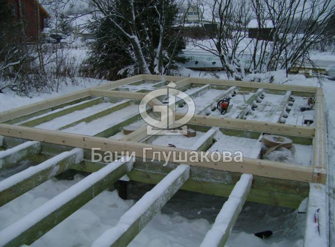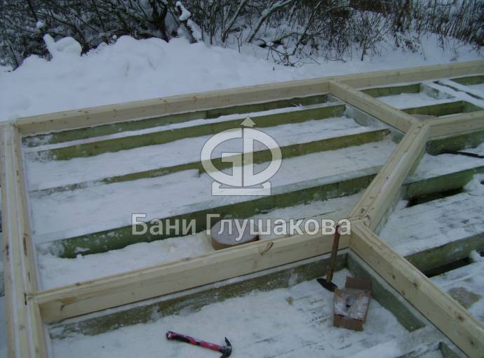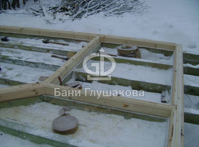 Покрываем антисептиком обвязочный брус, лаги и черновой пол