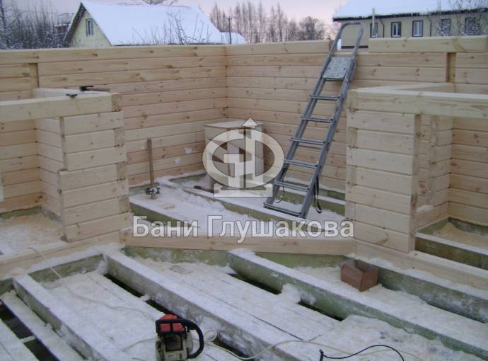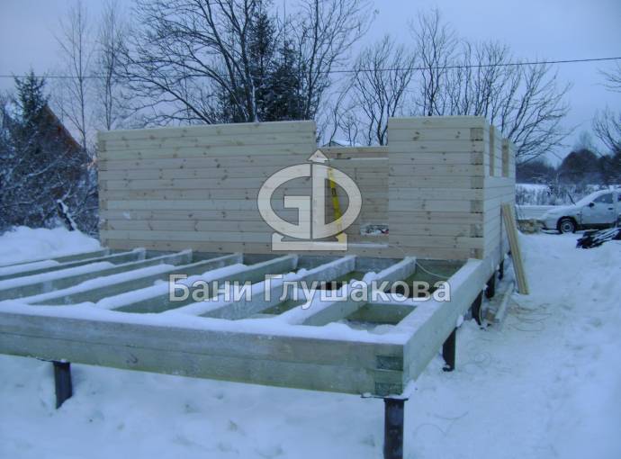 Ставили на винтовые сваи. Фундаментом у нас занимается отдельная бригада. Справились за 1 день. Баня большого размера, поэтому сруб строили долго. Мы собираем венцы со сверлением под каждый гвоздь — это занимает время, зато минимизирует вероятность появления межвенцовых щелей.