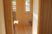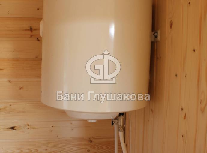 Здесь есть удобная парилка со всем необходимым: двухуровневые полки из белой осины не будут обжигать даже при интенсивном нагреве воздуха; аккуратная каменка занимает мало места , имея при этом бак для воды на 55 литров; стены обшиты осиновой бессучковой вагонкой. Небольшое пространство отведено под душевую кабинку: поддон, смеситель, бойлер, насос, бак для подачи воды — все очень современно и компактно. Остальное пространство занимает помещение для отдыха: здесь мы уже установили скамейки и столик, провели свет.