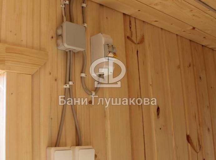 Входит в стоимость. Включает светильники в каждом помещении, вводный автомат, негорючий провод в парную, розетка в комнате отдыха (в банях-бочках розетка устанавливается по требованию).