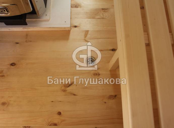 Установлен в помывочном отделении пластиковый герметичный поддон с сифоном для слива воды, в него вложен деревянный трапик (в планировках, где подразумевается душевое помещение). Ссылка на фото и видео