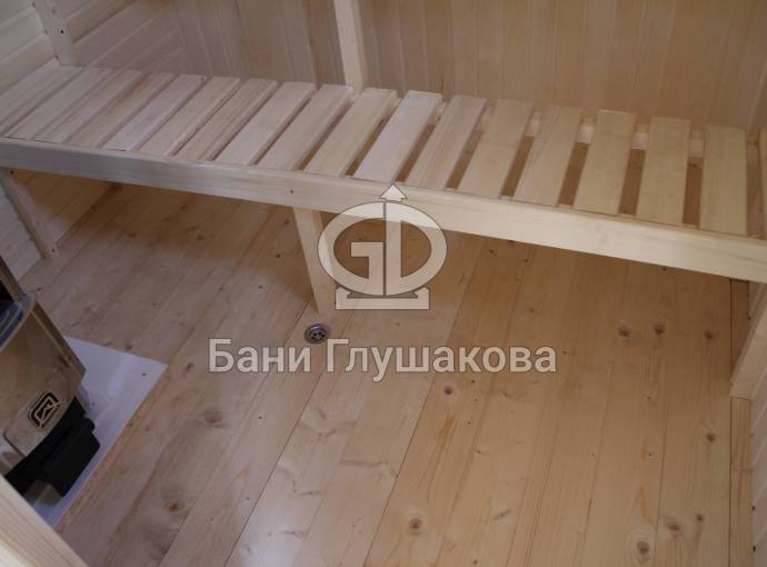 Установлен в помывочном отделении пластиковый герметичный поддон с сифоном для слива воды, в него вложен деревянный трапик (в планировках, где подразумевается душевое помещение). Ссылка на фото и видео
