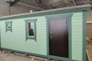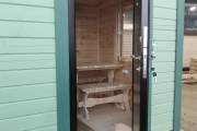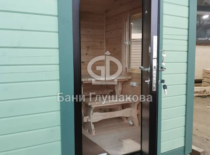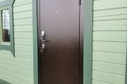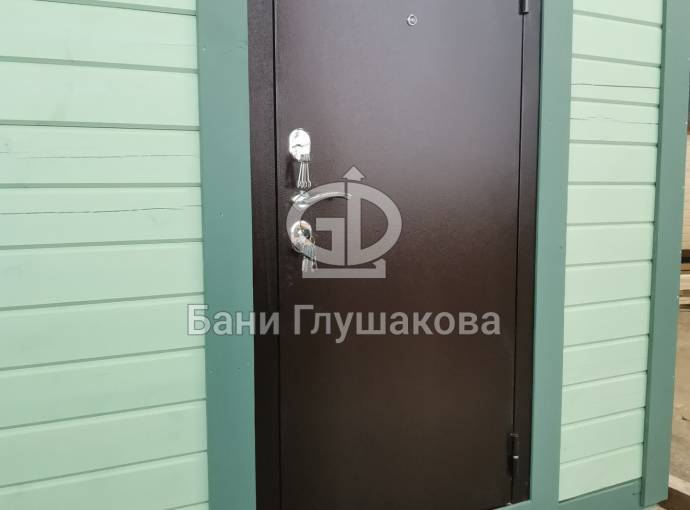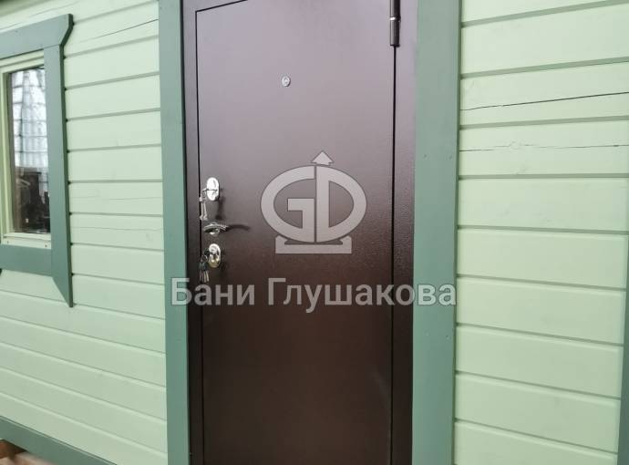 Появилась опция установки металлических входных дверей в перевозные бани. Такие двери, конечно, дороже деревянных, но зато они избавлены от «болезней» дерева — не разбухают, не усыхают, не деформируются.