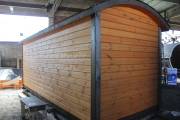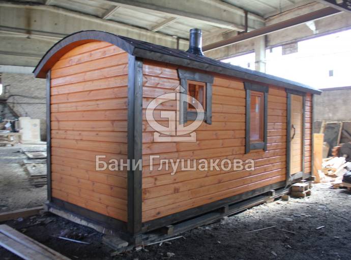 На основе представленного проекта можно построить похожую перевозную баню с дополнительными опциями: выносной топкой, душевой системой, откидным столиком, декоративной подсветкой. Цену, конечно, нужно будет пересчитать — всё индивидуально.