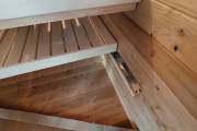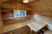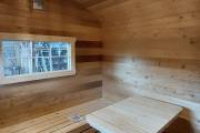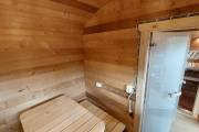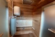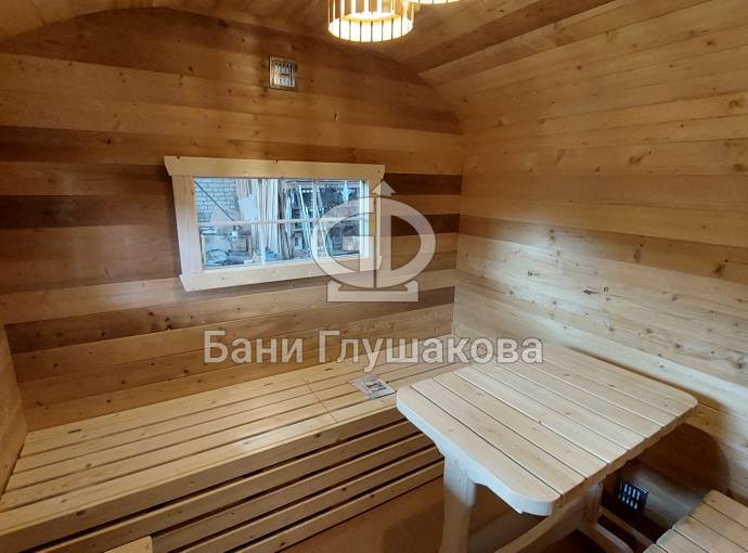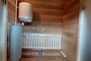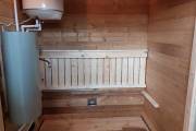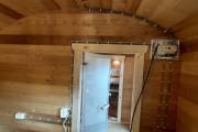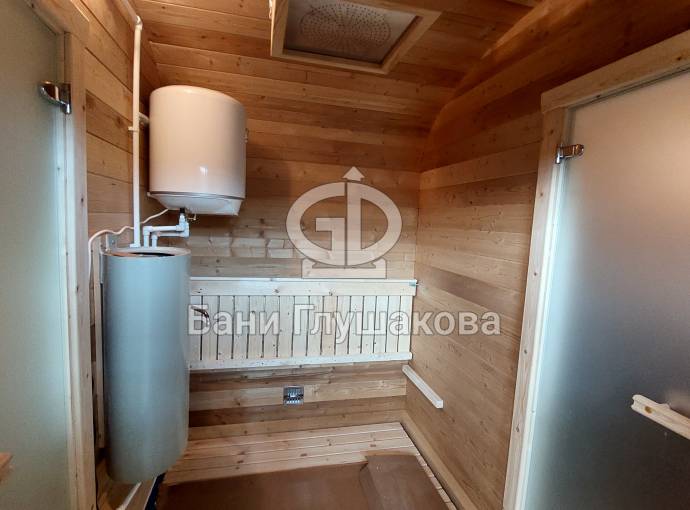 Размер 2,2х6 метров. Внутри 3 помещения: комната отдыха, помывочная и душ. Комплектация топ: обливное устройство «Обливасту», вентиляция «Второе дыхание» и «Димасту», металлический экран вокруг печи и удобные клапаны-задвижки. В общем, эта банька собрала в себе все наши последние улучшалки.