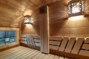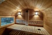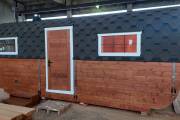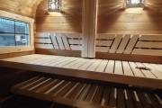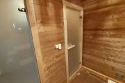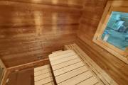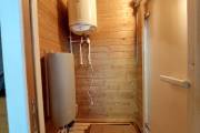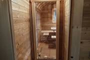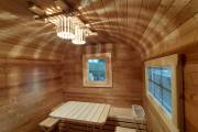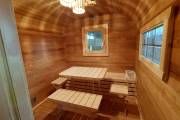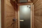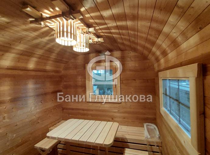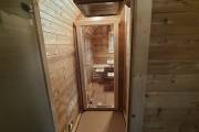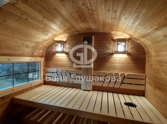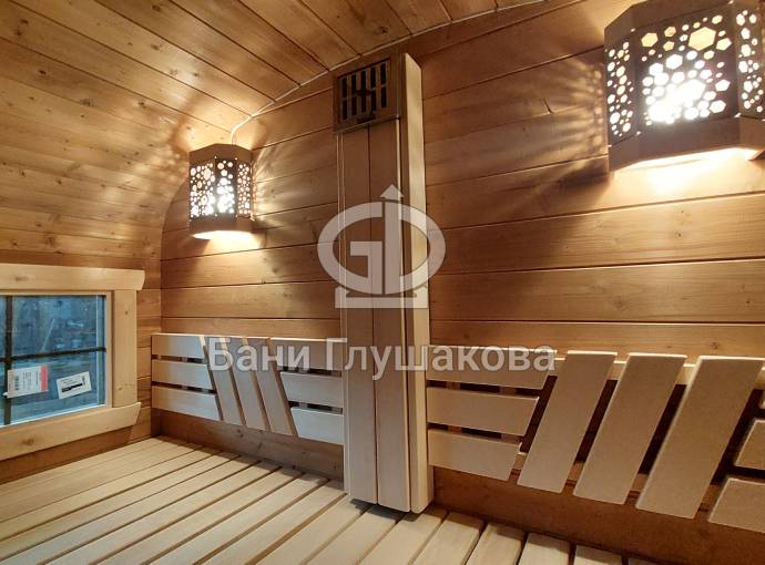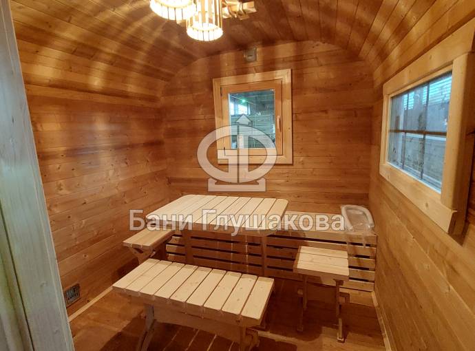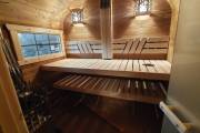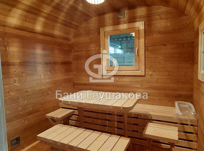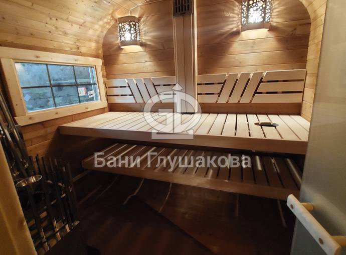 Размер 2,2х6 метров. Баня изготовлена из термомодифицированной доски. Комплектация отличная: обливное устройство «Обливасту», вентиляция «Второе дыхание» и «Димасту», металлический экран вокруг печи и удобные клапаны-задвижки.