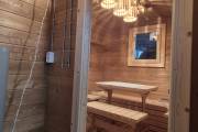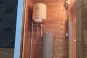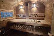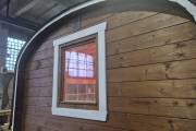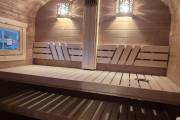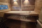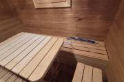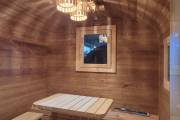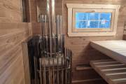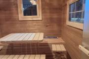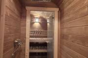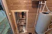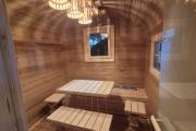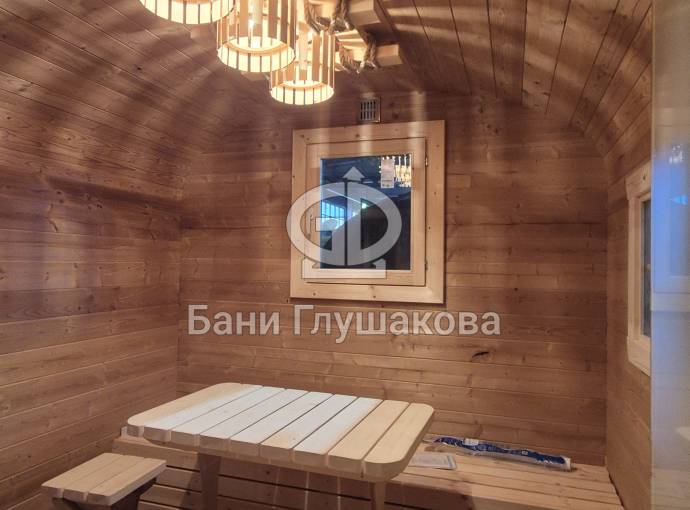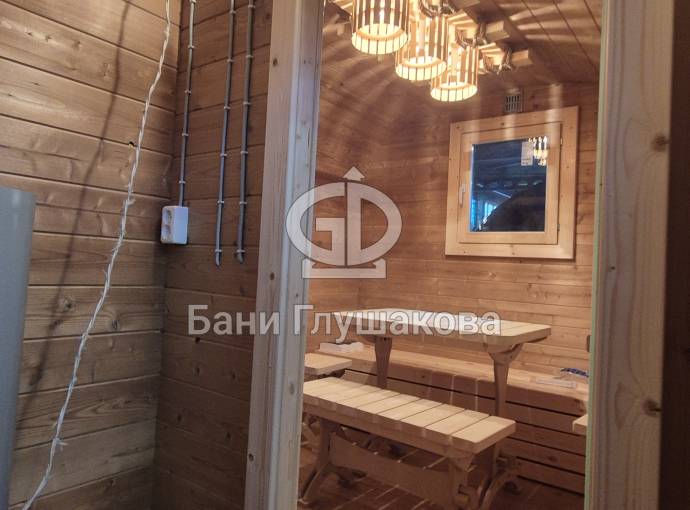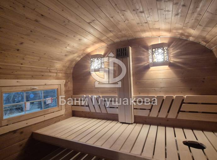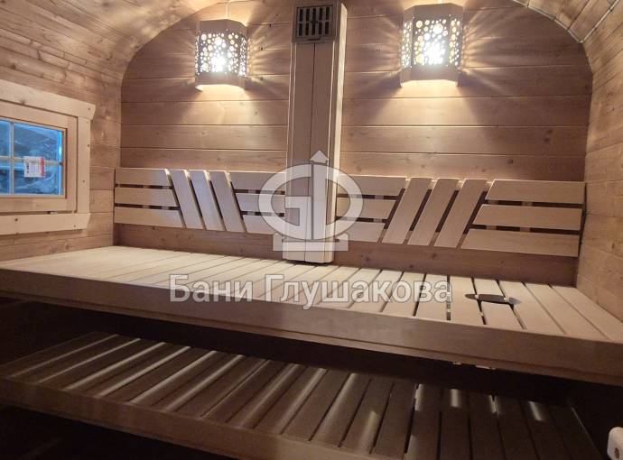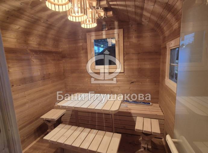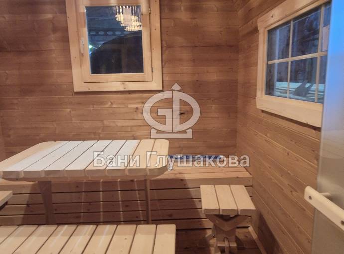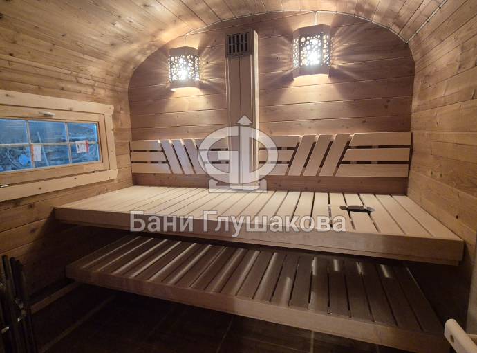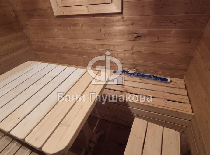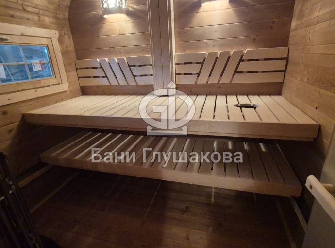 Размер 2,2х6 метров. Баня изготовлена из термомодифицированной доски. Комплектация отличная: обливное устройство «Обливасту», вентиляция «Второе дыхание» и «Димасту», металлический экран вокруг печи и удобные клапаны-задвижки.