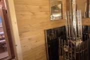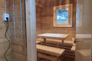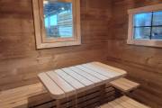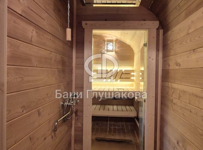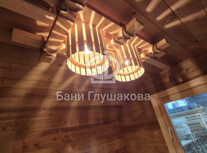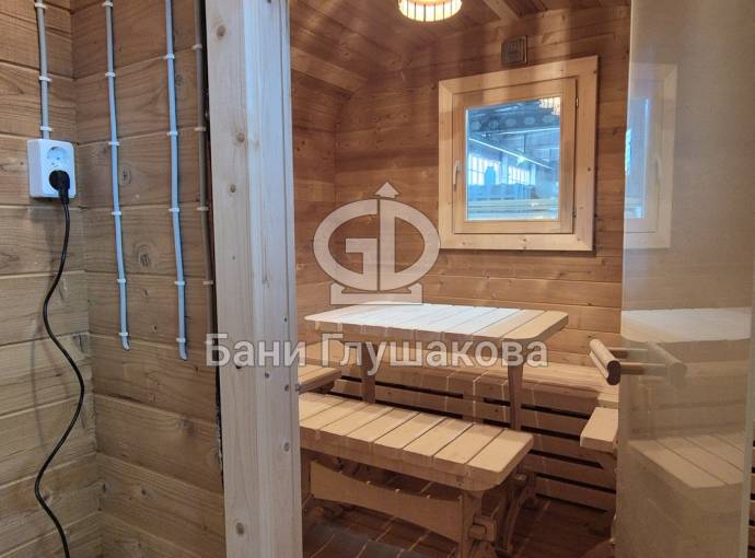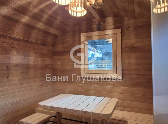 Баня изготовлена из термомодифицированной доски высокой степени обработки – тёмный насыщенный цвет и безупречная устойчивость ко влаге. Комплектация отличная: обливное устройство «Обливасту», вентиляция «Второе дыхание» и «Димасту», металлический экран вокруг печи и удобные клапаны-задвижки.