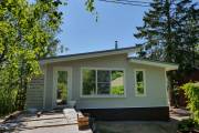 В итоге удалось построить эффектную одноэтажную баню с интересной разноуровневой крышей (такие сейчас очень популярны в странах Северной Европы и Скандинавии). Сбоку сделана пристройка-дровяник. Большие панорамные окна отлично сочетаются со стеклянной входной дверью-стеклопакетом.