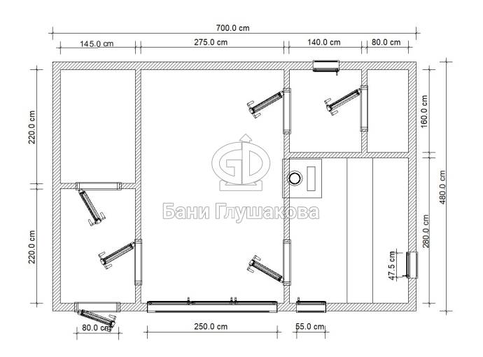 Размер бани довольно большой — 4,8 на 7 метров. Внутри есть небольшой предбанник, санузел/хозблок, большая жилая комната, помывочная, парная и бойлерная. По сути такая баня может полноценно заменить собой дачный домик.