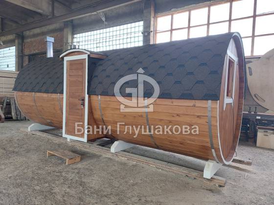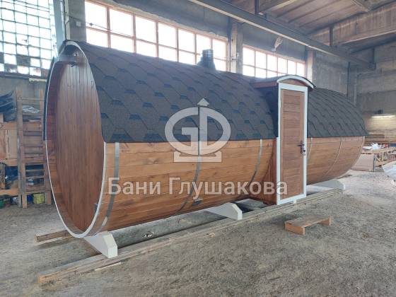 Наш модельный ряд разнообразен: от совсем маленьких мини-бань 2 метра длиной до больших 6- 7-метровых бань со входом посередине. Стандартный диаметр — 2,1 м. По спецзаказу можем делать модели увеличенного диаметра со сборкой на участке.