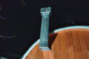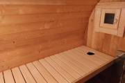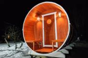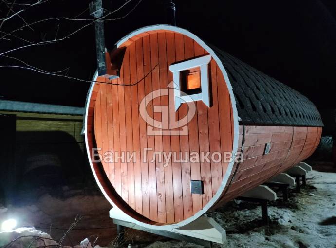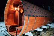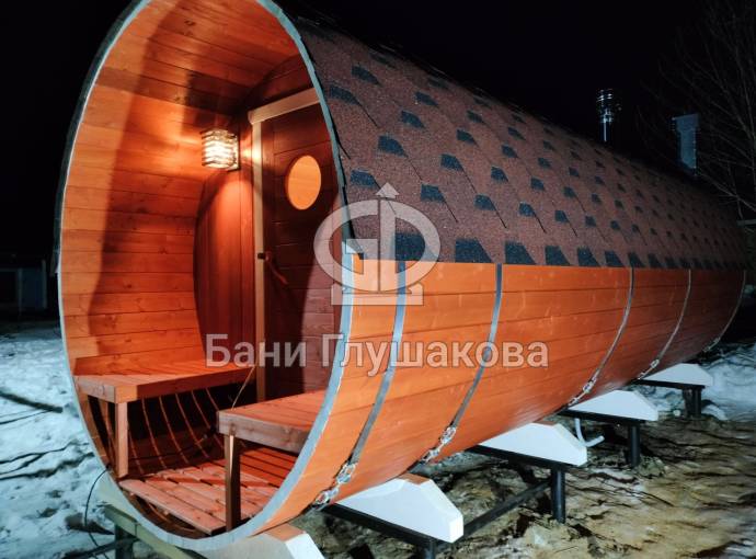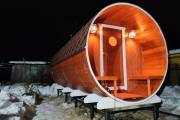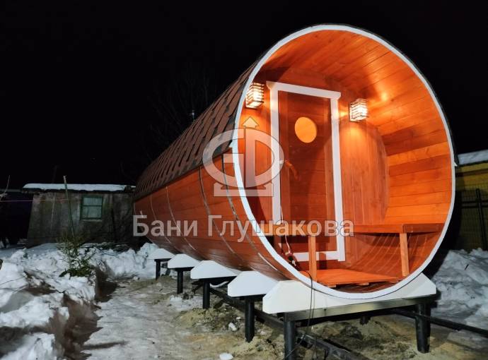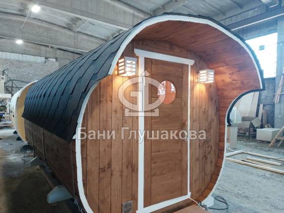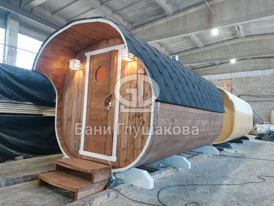 Это одна из самых популярных бань-бочек с террасой. Она имеет практически максимально допустимую длину для перевозной бани — 5,7 метров, — при этом имеет всего два отделения: парилку и предбанник. Благодаря этому внутренние помещения получились довольно просторными. В базовом варианте диаметр 2,1 метр, но также можно увеличить – на фото баня диаметром 2,4 метра.
