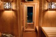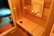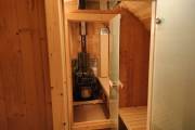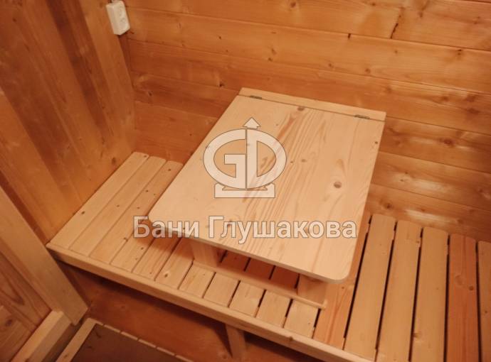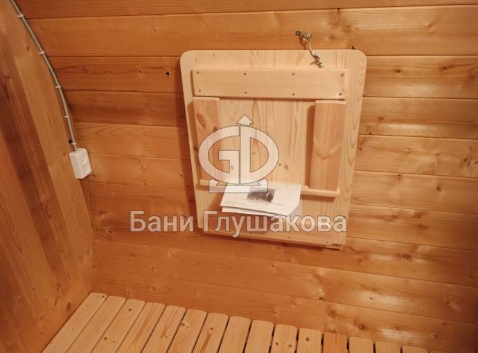 Можно установить насосную станцию, бойлер, бак, душ, устанавливается как в душевой комнате так и в маленькой бане, но уже слева или с права в комнате отдыха, а душ выводится в этом случае в парную.