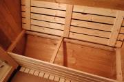 Такую баню можно заказать (пока что) из еловой и кедровой доски, а также из термодревесины. Последний вариант настоятельно рекомендуем – да, этот материал дороже, но с ним не будет проблем, поверьте. Никакие сезонные колебания температуры и влажности не приведут к неприятностям в виде образования щелей. Термодоска не шевелится и не гниёт.