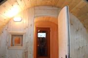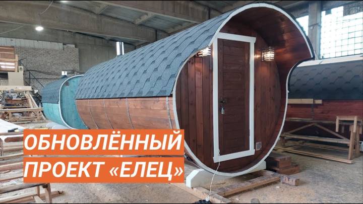 Проект «Елец» — это классическая круглая баня бочка с увеличенным диаметром 2,3 метра (стандартный — 2,1 м). Длина 5 метров, плюс козырёк. Внутри 3 отделения: парилка, помывочное отделение и предбанник.