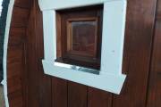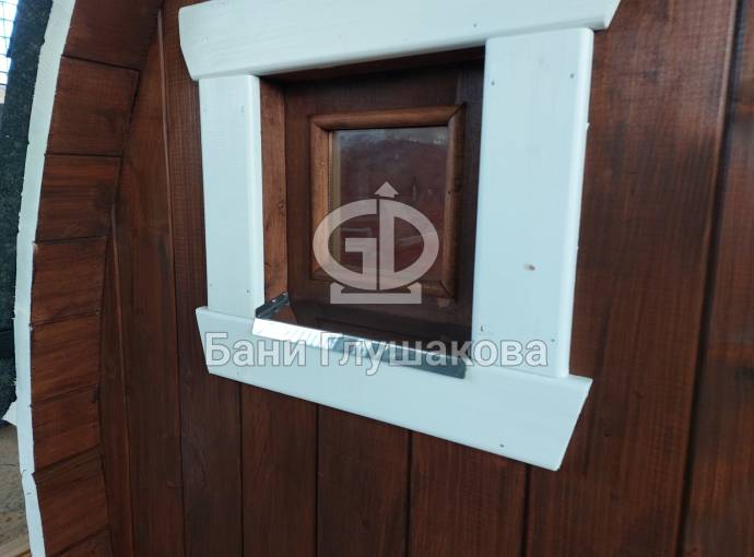 Изготавливается из толстой бочковой доски 42 мм. На выбор можно заказать сборку из ели, кедра или термомодифицированной древесины (на фото как раз баня из ТМД).