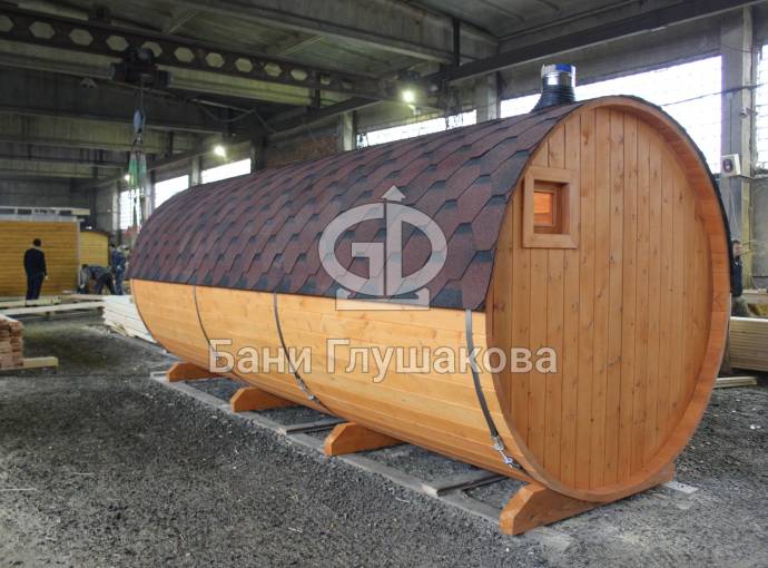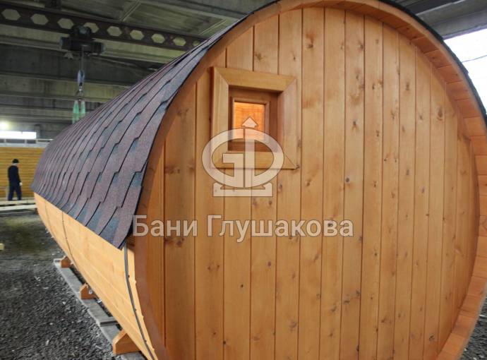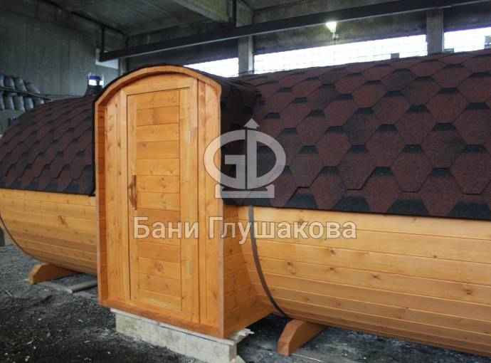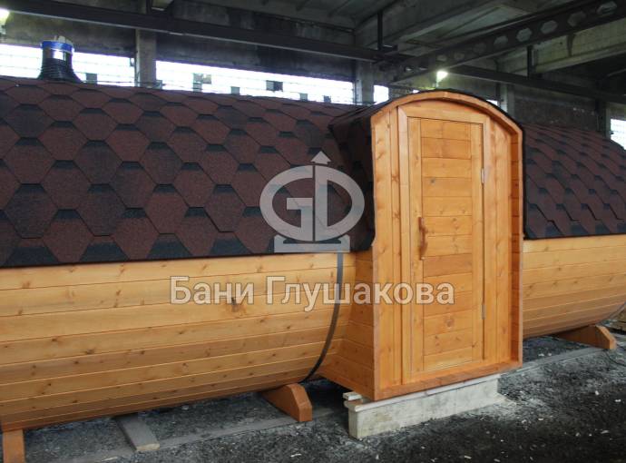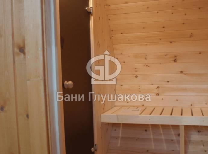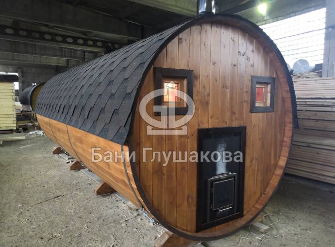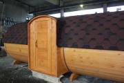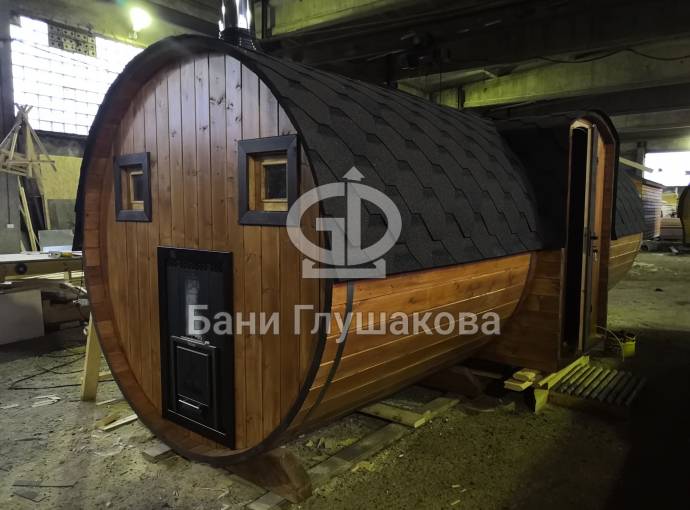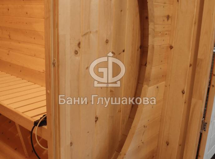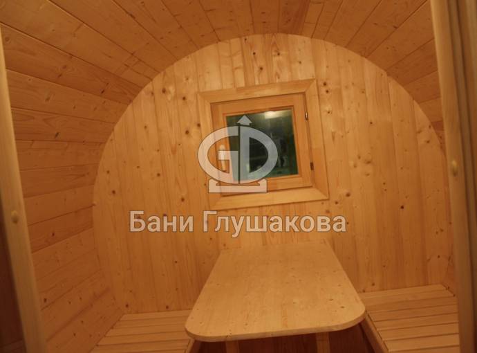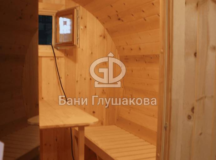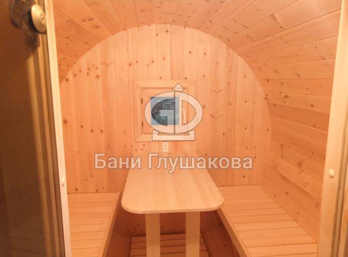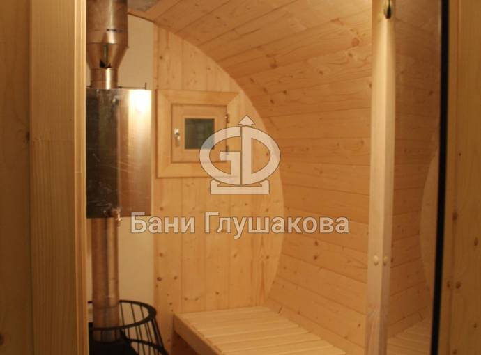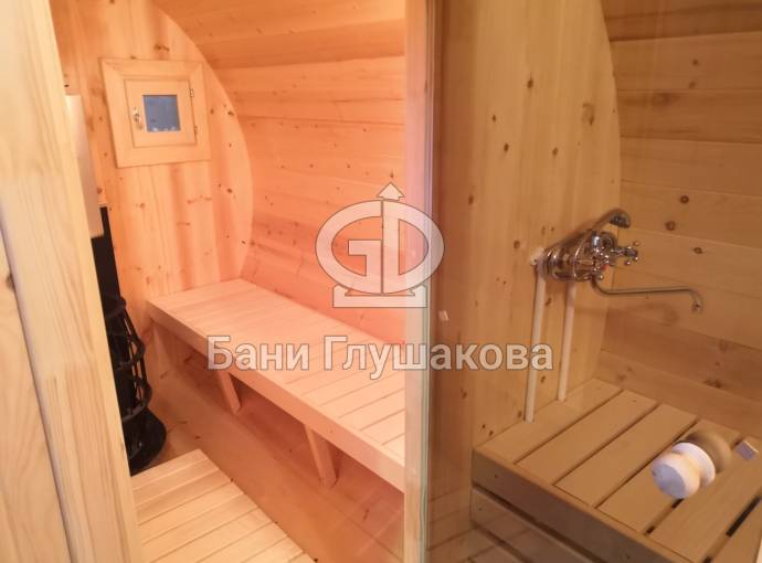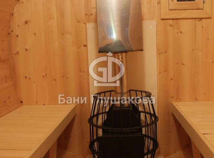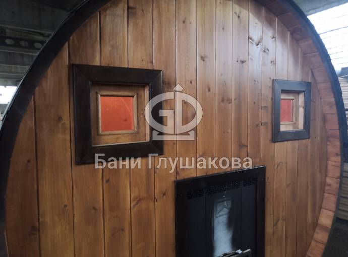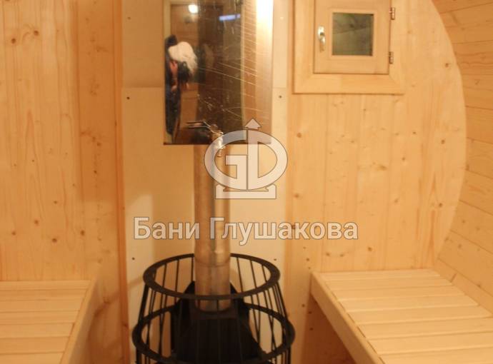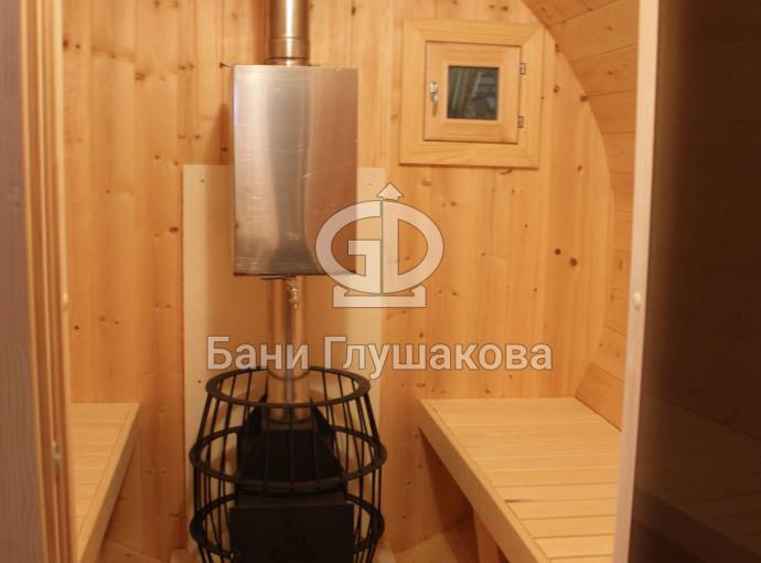 В остальном отделка бани бочки «Коломна» стандартна — печь с баком для воды на трубе, осиновые полки, трапики, стеклянные двери, электропроводка. Все под ключ. После установки на участке можно сразу приступать к эксплуатации.