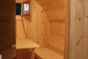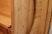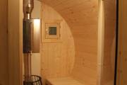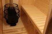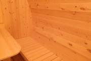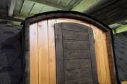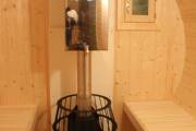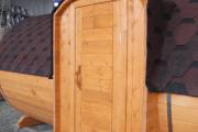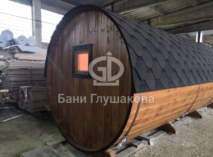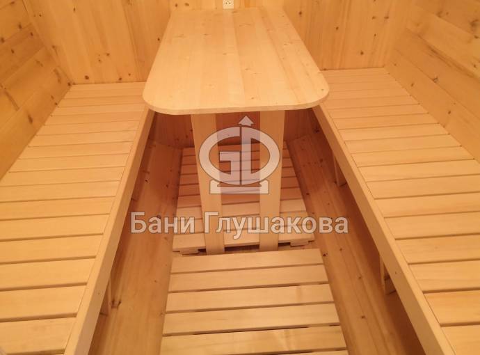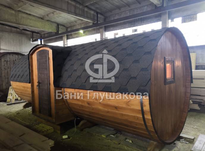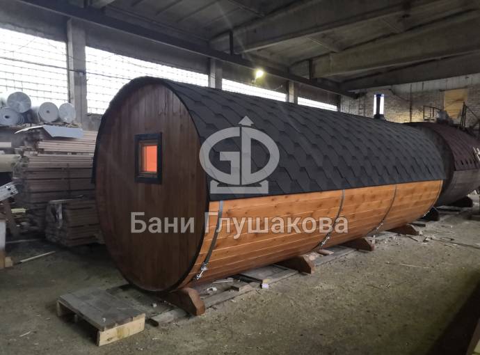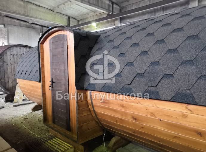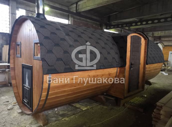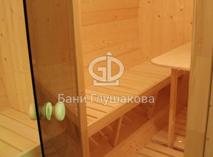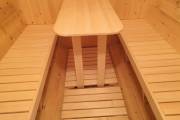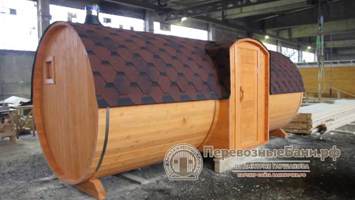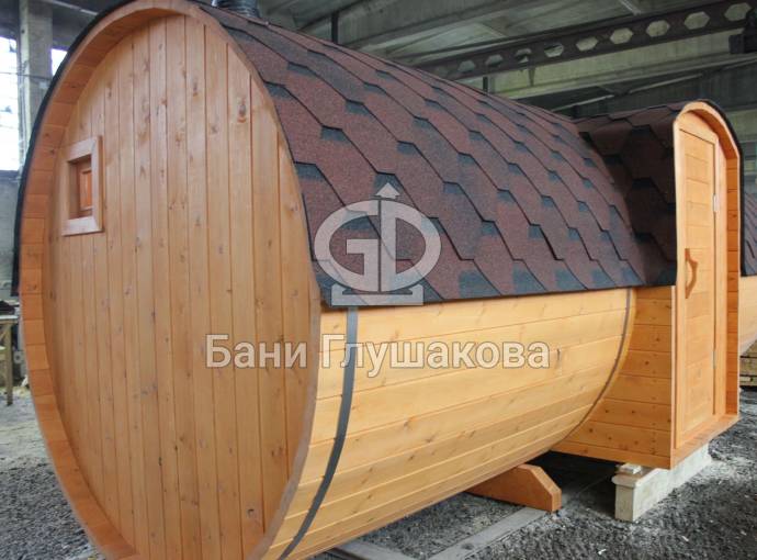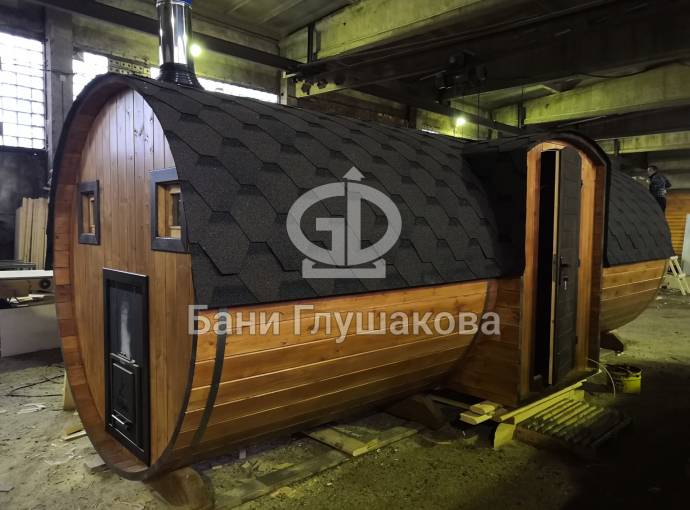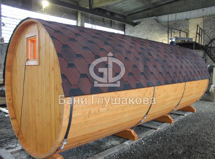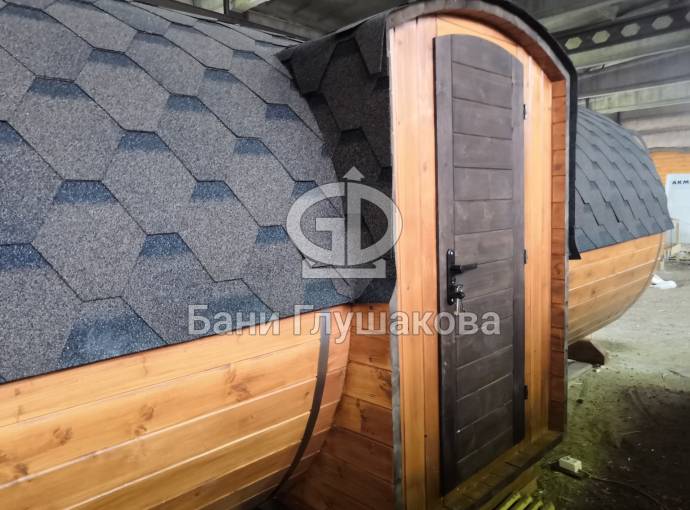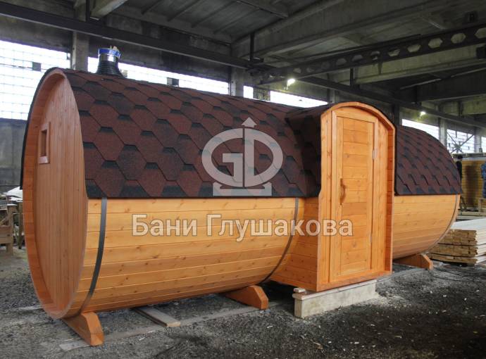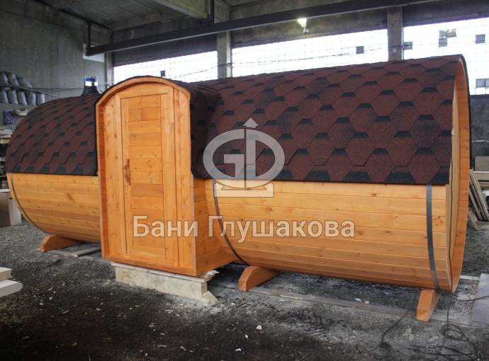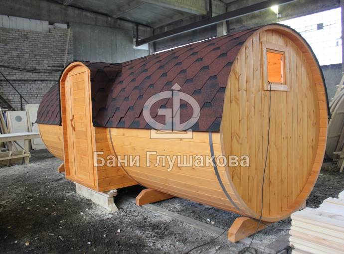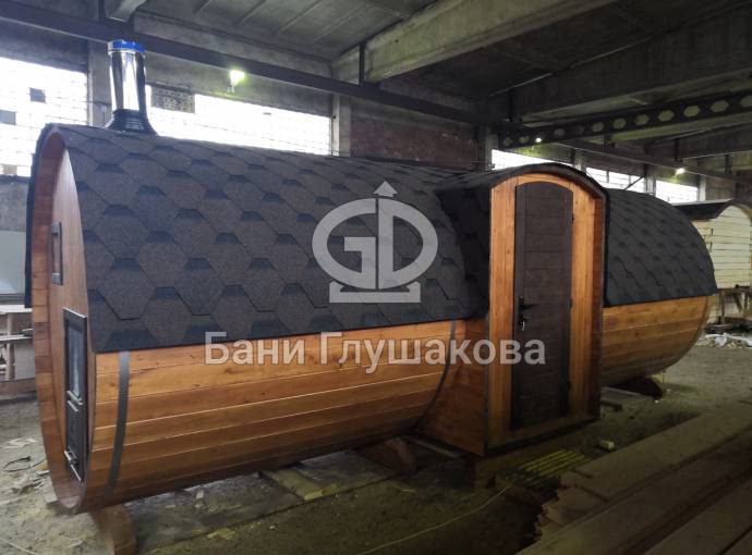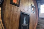 В остальном отделка бани бочки «Коломна» стандартна — печь с баком для воды на трубе, осиновые полки, трапики, стеклянные двери, электропроводка. Все под ключ. После установки на участке можно сразу приступать к эксплуатации.