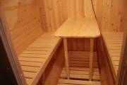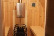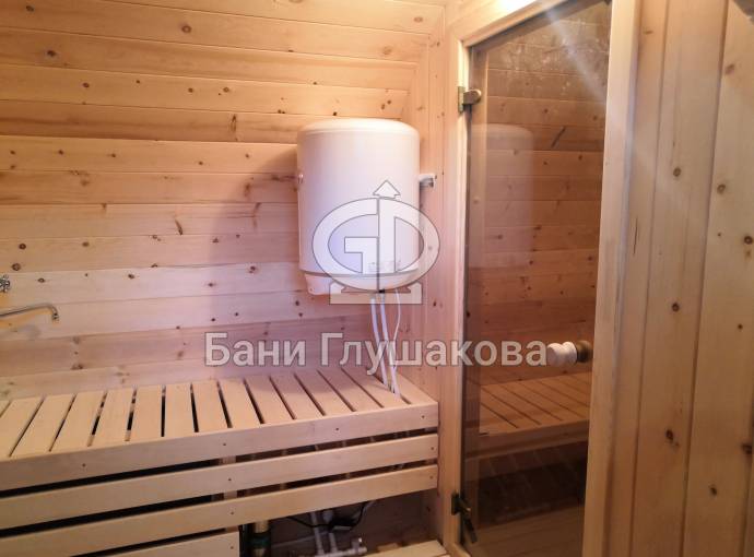 Можно установить насосную станцию, бойлер, бак, душ, устанавливается как в душевой комнате так и в маленькой бане, но уже слева или с права в комнате отдыха, а душ выводится в этом случае в парную.