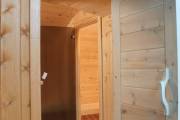 Мы подумали и попробовали перенести входную группу, расположив ее ровно посередине бани. Получилась неординарная конструкция, которая пришлась клиенту по душе. Так у бани появился небольшой тамбур, где можно оставить верхнюю одежду. С одной стороны которого — парилка и моечное отделение, с другой — комната отдыха со столом и скамейками.