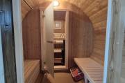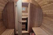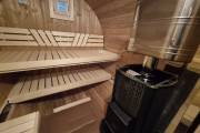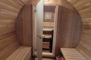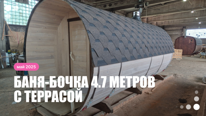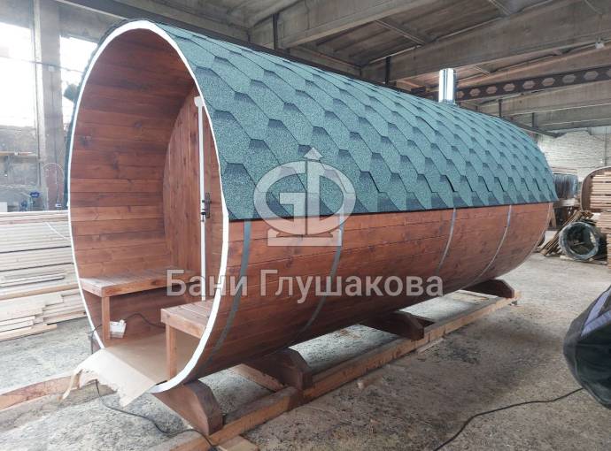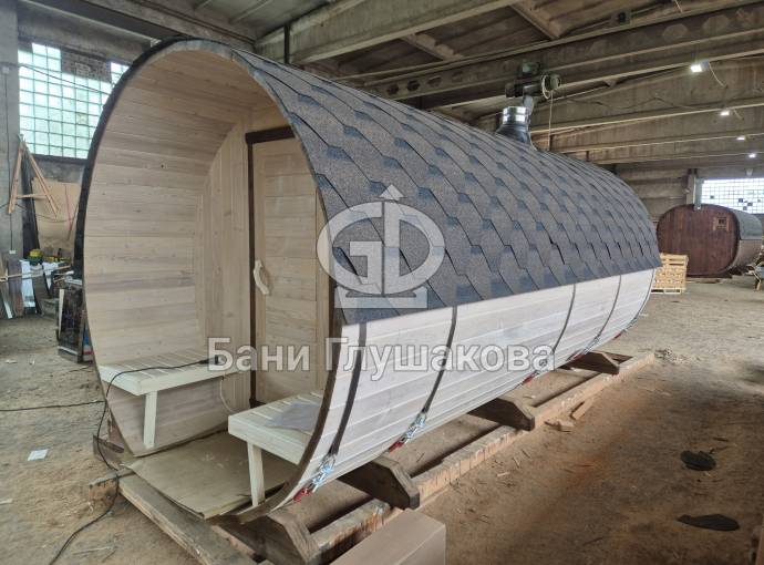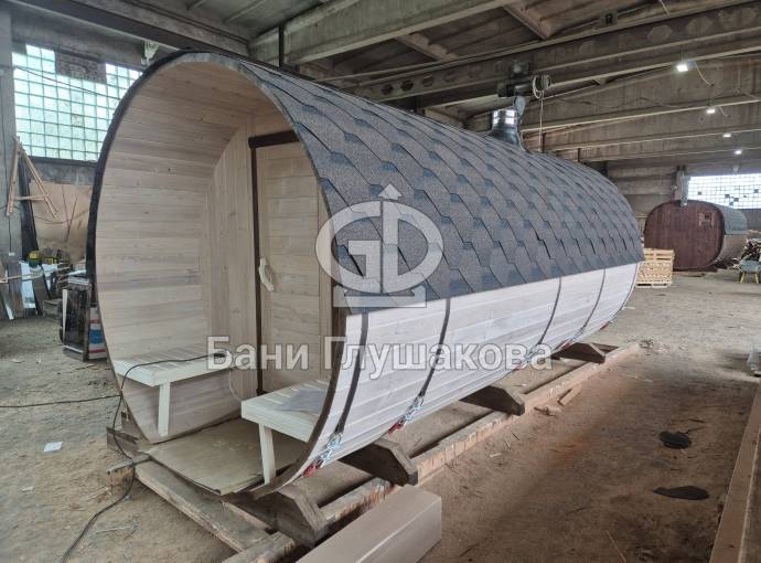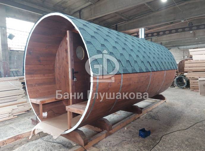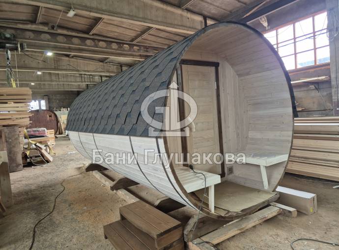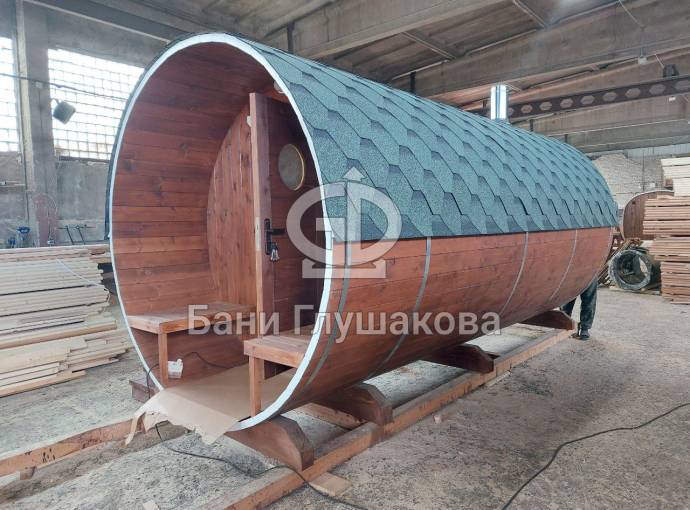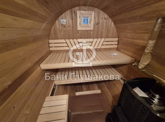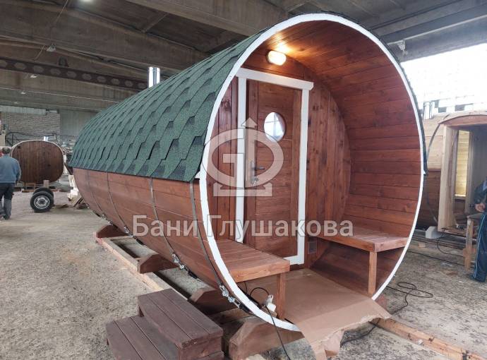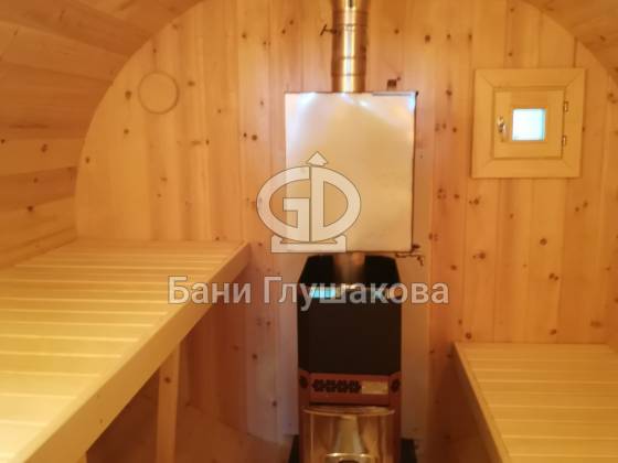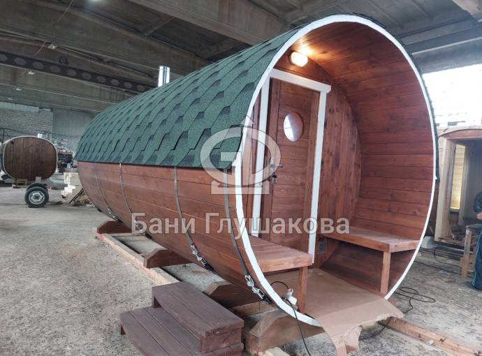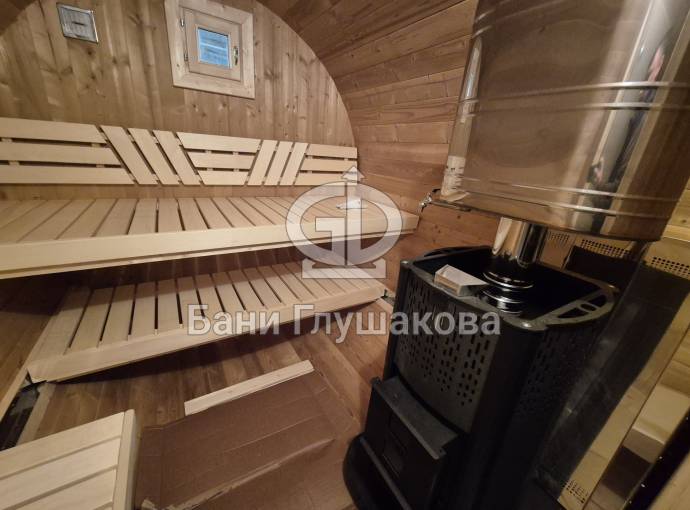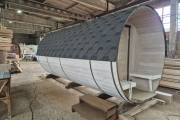 Баня-бочка «Коломна» 4,7м с террасой и печью под ключ