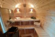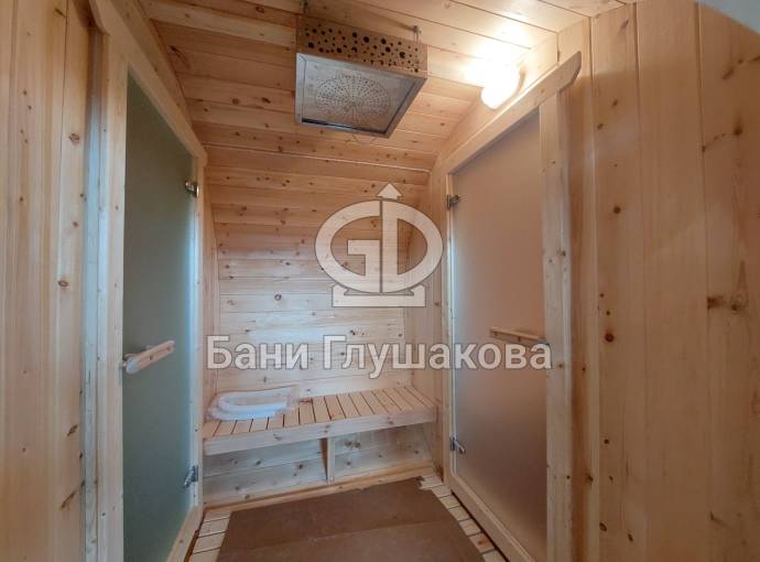Баня на фото и видео изготовлена из кедровой древесины, также возможна сборка из ели и термодревесины. Последний вариант крайне рекомендуем, потому что этот материал не набирает влагу, а значит не деформируется. Бани из термодревесины не болеют «щелями» в засушливое время года.