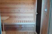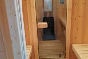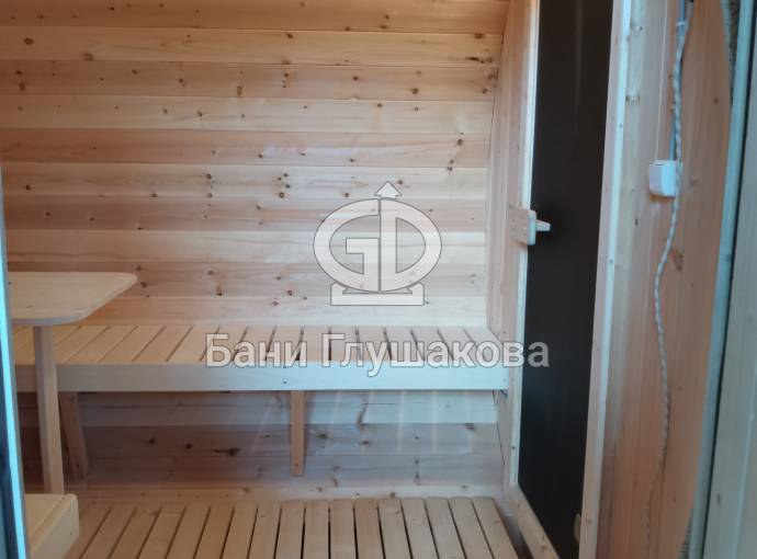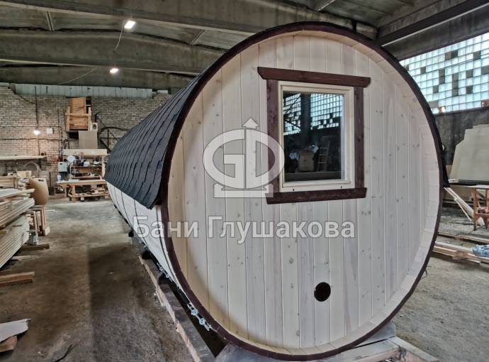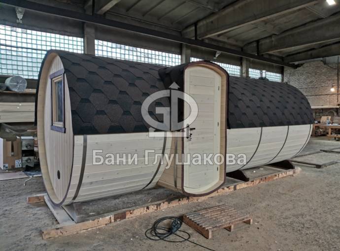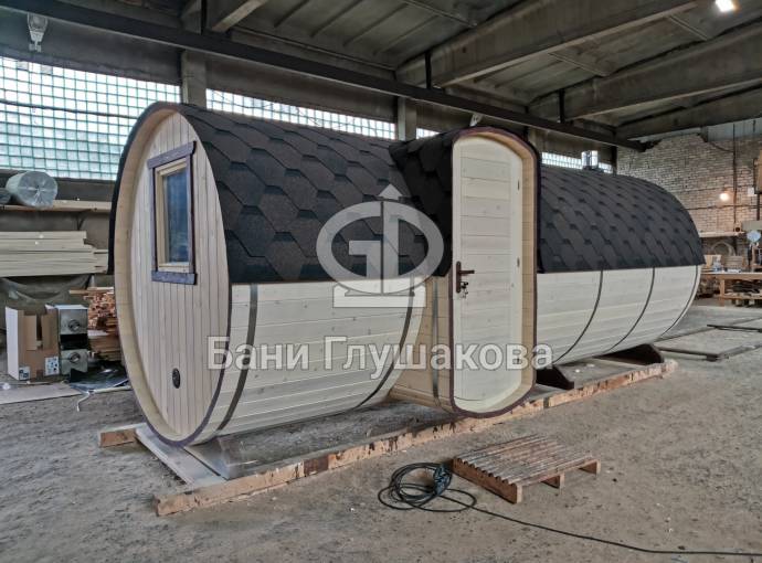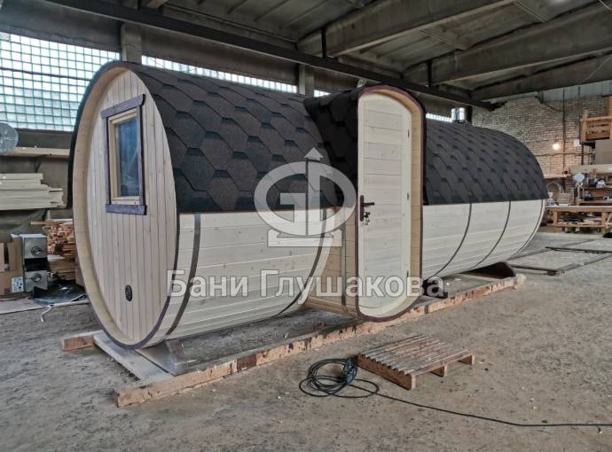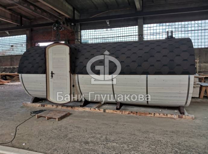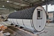 Баня большая — 5,7 на 2,2 метра. Овальная входная группа возможна только в банях диаметром 2,2 метра. Внутри 3 отделения: комната отдыха, помывочное помещение и парная.