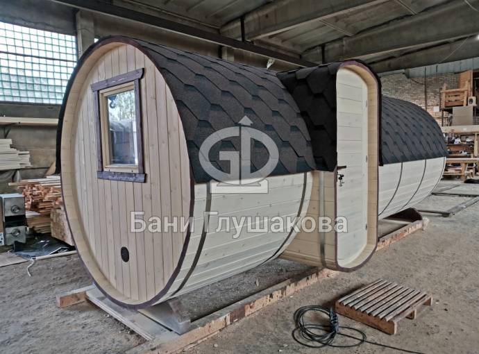 Круглая баня бочка «СУПРА» со входом в комнату отдыха