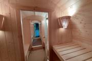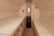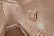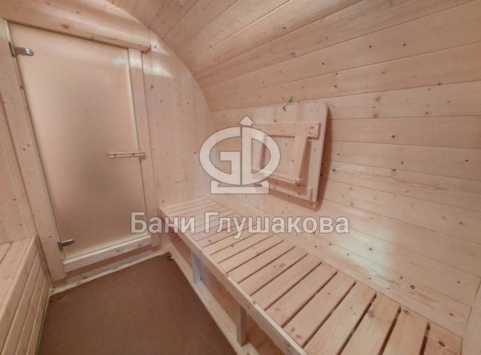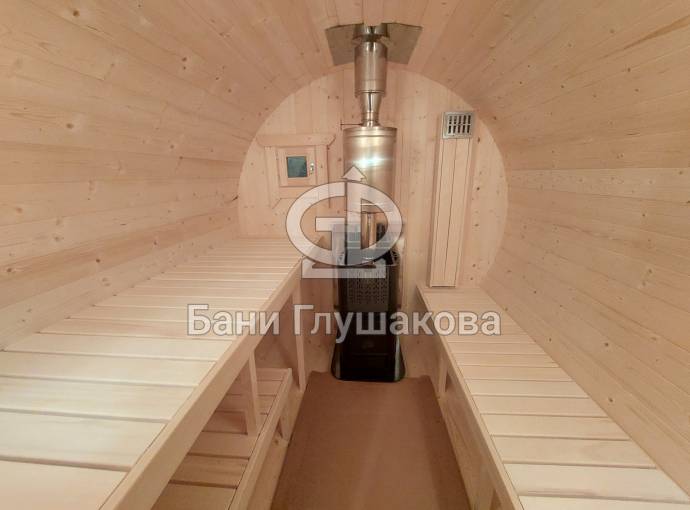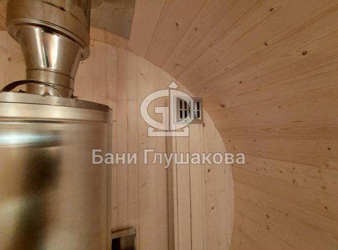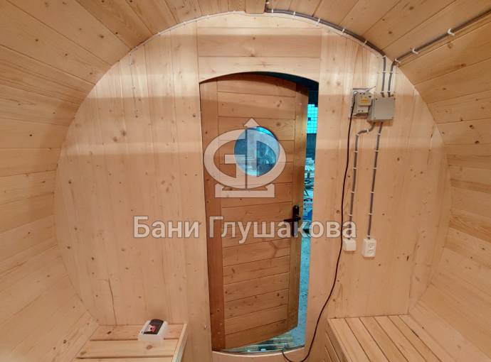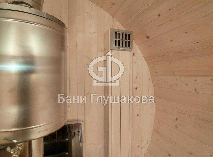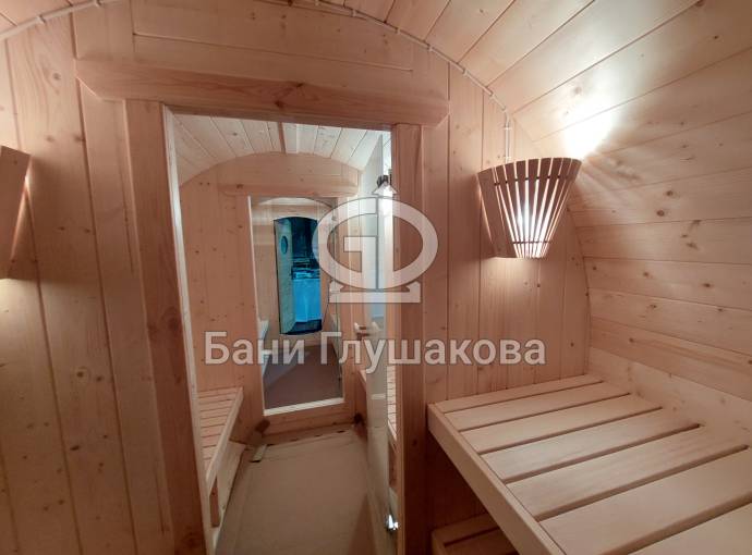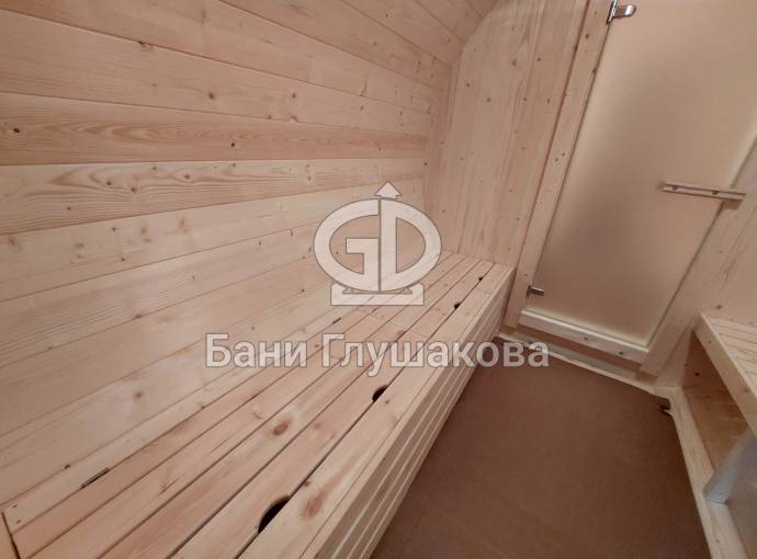 Диаметр чуть увеличен до 2,3 м по сравнению со стандартным 2,1 м — и эти 20 см реально играют роль. В парной спокойно с комфортом размещаются 4 крупных мужчины.