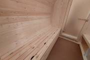 • есть небольшой предбанник (комната отдыха) — здесь установлены 2 скамейки и откидной столик. Одна скамейка с откидной крышкой — получается такой ящик для хранения дров или каких-то вещей.