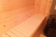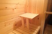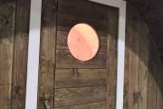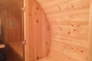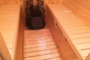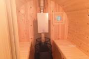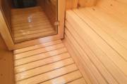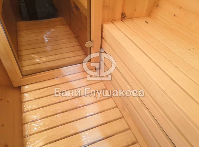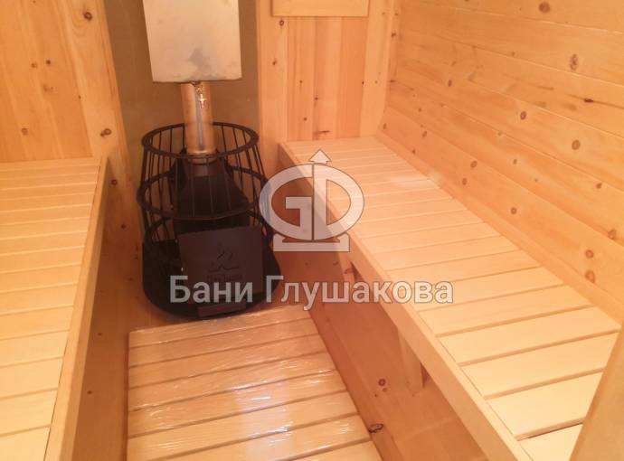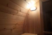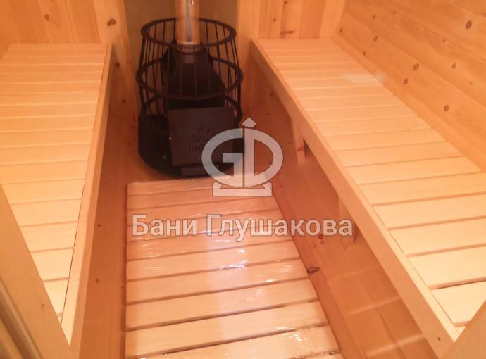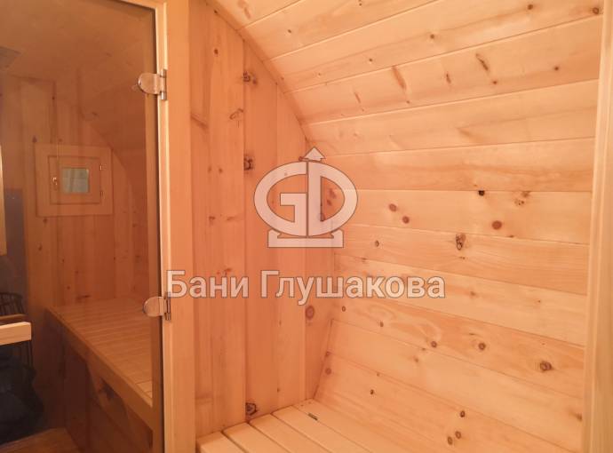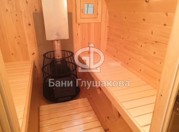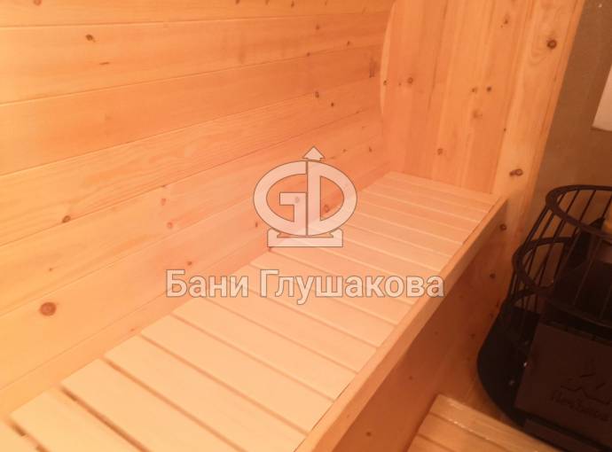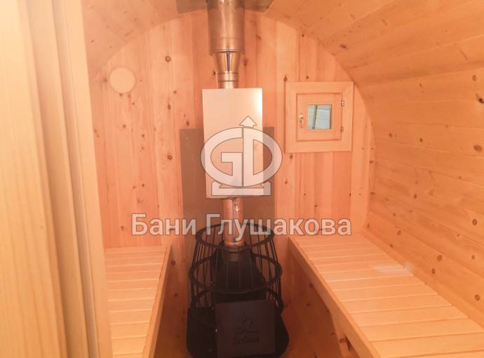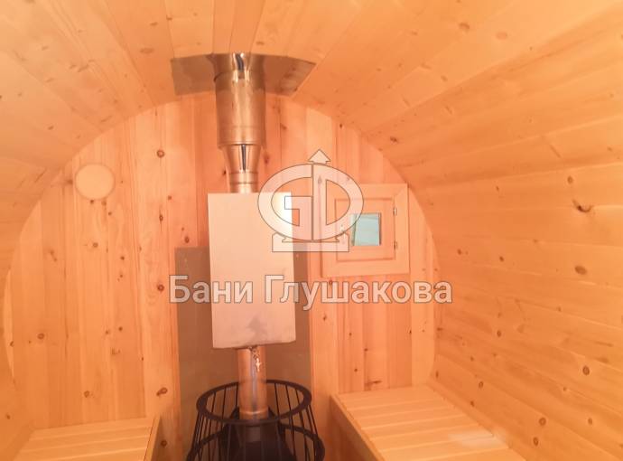 Эта баня из кедра, который не пошел на заказные бани. Маленькая, внутри парная и предбанник. Снаружи обязательный козырёк. В предбаннике столик, скамейка с откидным верхом, трап, светильник. В парную установлена стеклянная дверь. Пологи стоят по разные стороны, между ними установлена печь с баком для воды. Простая и недорогая баня бочка ждёт своего хозяина на выставке в Баранцево в Москве.