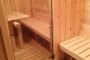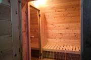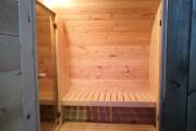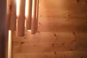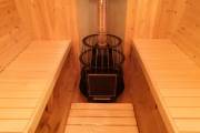 Можно изготовить из ели или кедра, с выносной топкой на улицу или по классической схеме. Цвет покраски можно выбрать из палитры красок Pinotex и Биотекс.