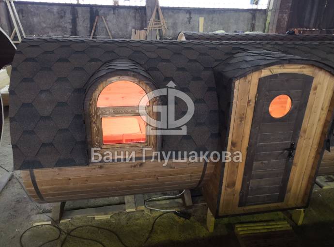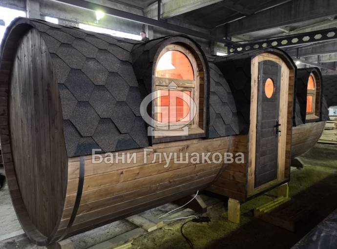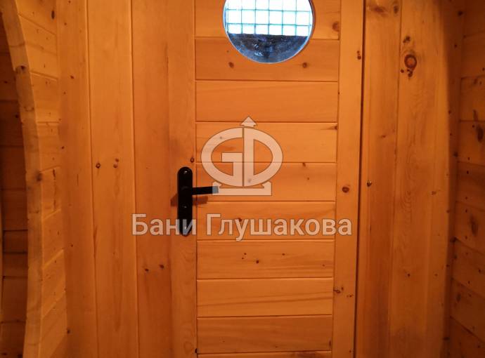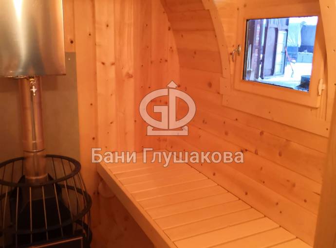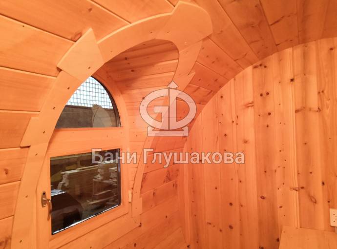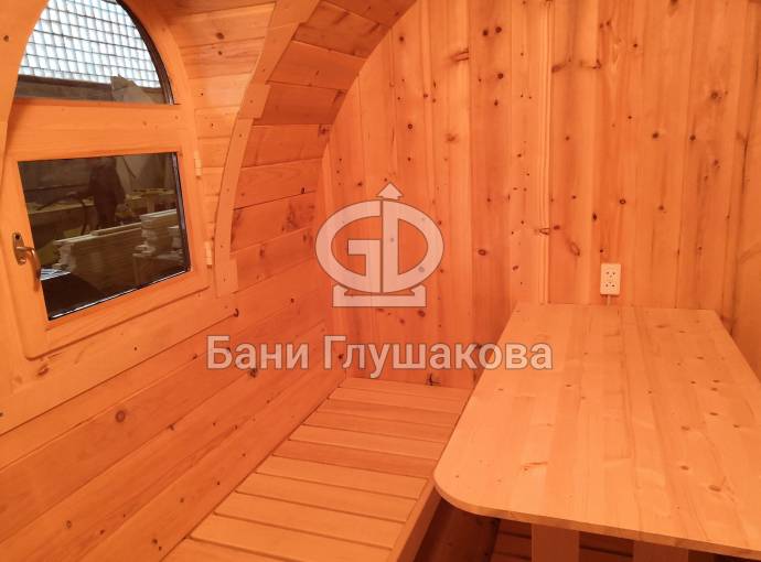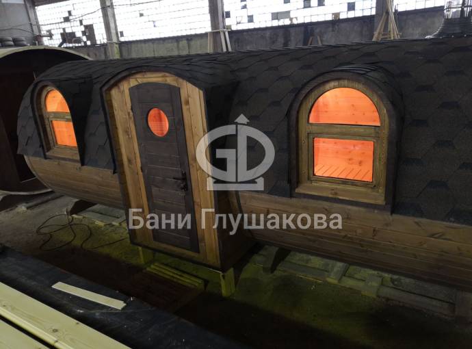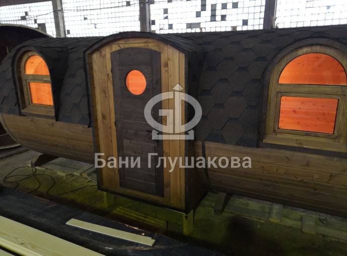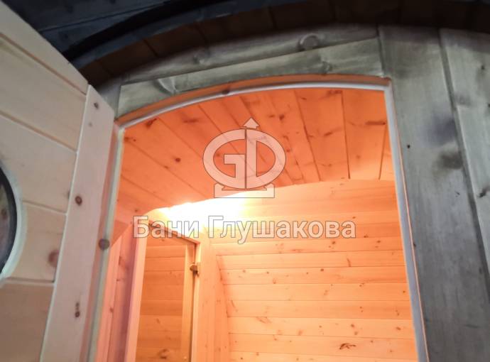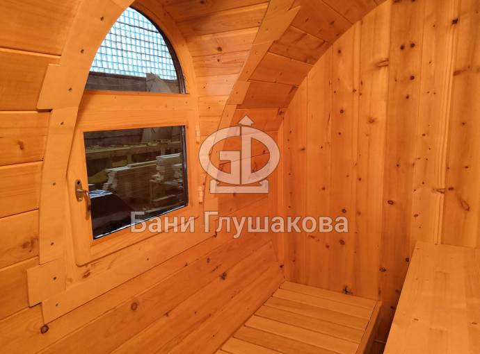 У нас тут что-то новенькое — круглая баня бочка под названием «Светофор». Это перевозная баня со входом посередине, а по сторонам от него — два симпатичных арочных окна. Они не только здорово украшают внешний вид бани, но и делают внутренние помещения светлыми и очень уютными. Вот так изящно мы решили проблему тёмных мобильных бань.