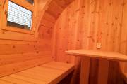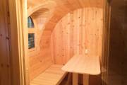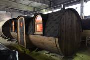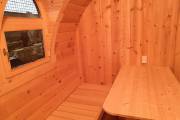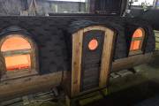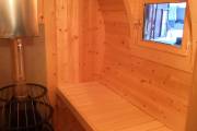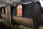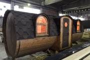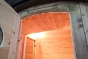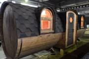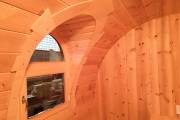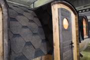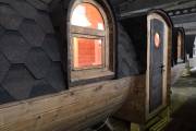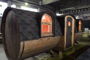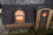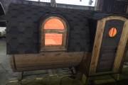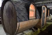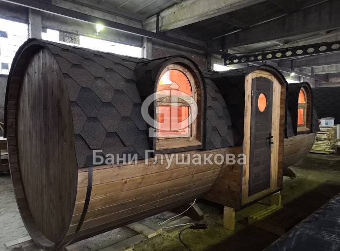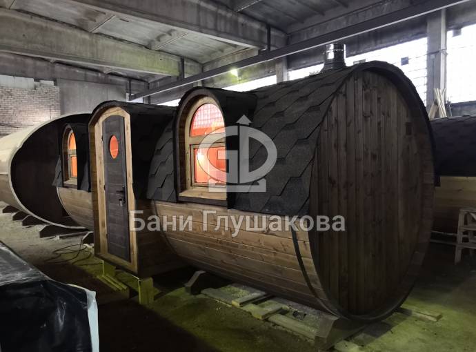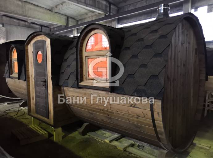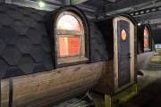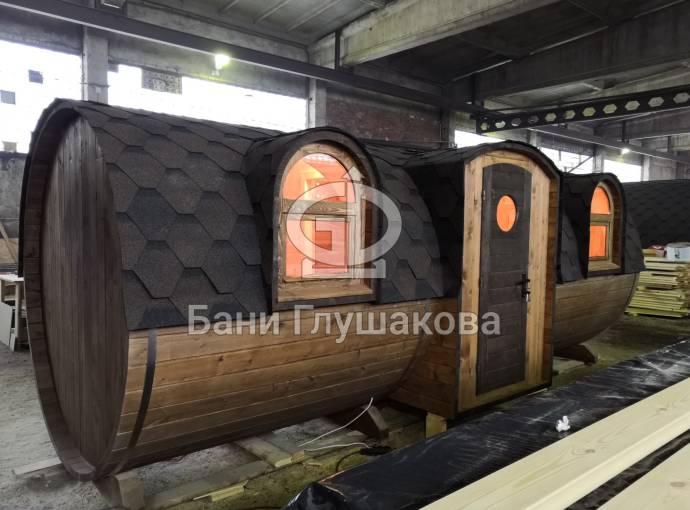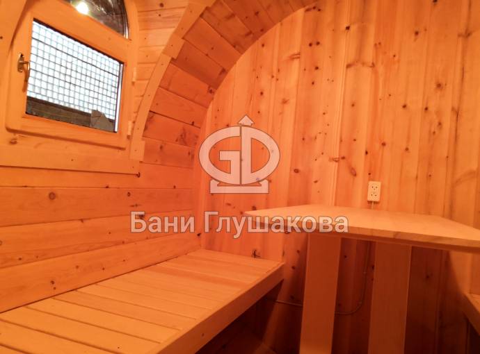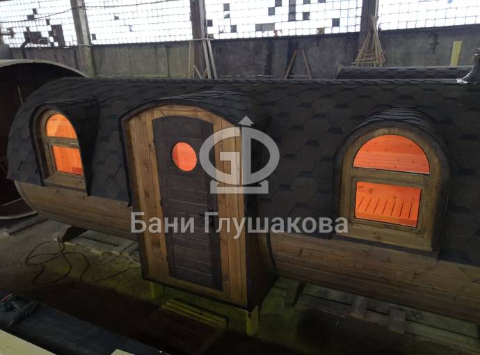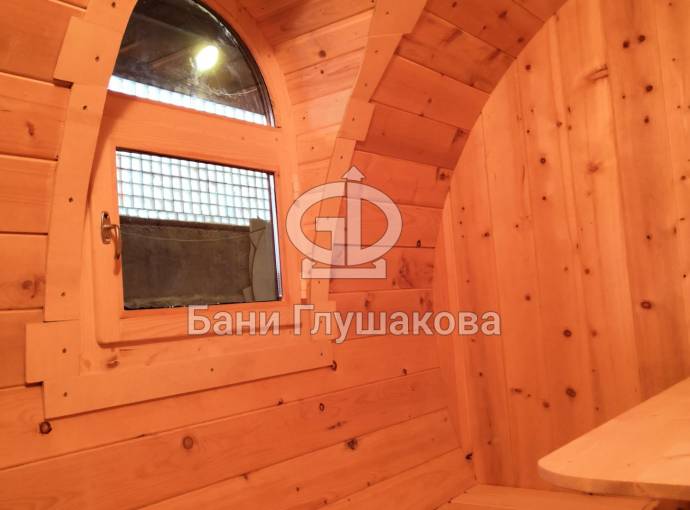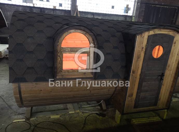 У нас тут что-то новенькое — круглая баня бочка под названием «Светофор». Это перевозная баня со входом посередине, а по сторонам от него — два симпатичных арочных окна. Они не только здорово украшают внешний вид бани, но и делают внутренние помещения светлыми и очень уютными. Вот так изящно мы решили проблему тёмных мобильных бань.