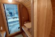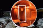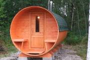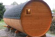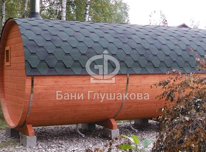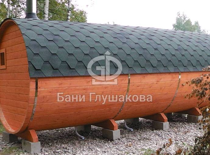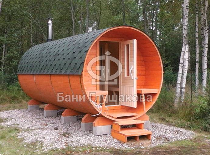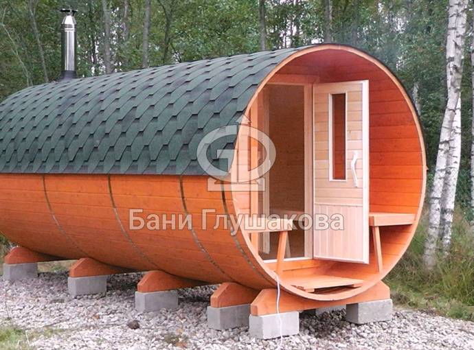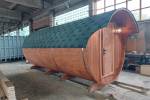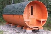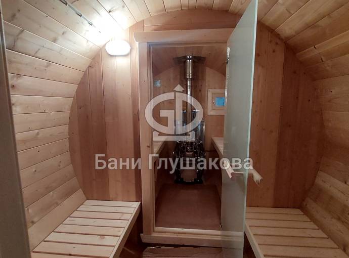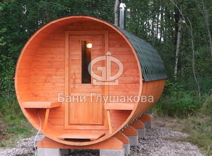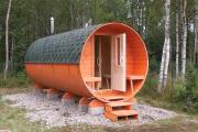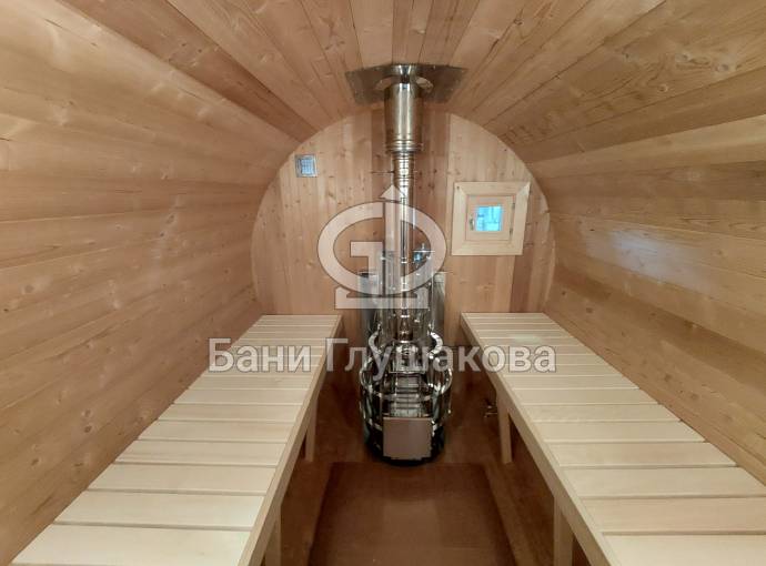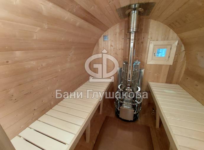 Круглые бани бочки уже стали классикой перевозных бань. Типичный представитель — проект «Волоколамск». Баня имеет максимальный размер 5,7 метров + небольшая терраса. Внутри три помещения: предбанник (по обе стороны от входа установлены скамейки), моечное помещение (по желанию клиента можно установить душевую систему), парная (установлены пологи, между ними — печь с баком для воды на трубе).