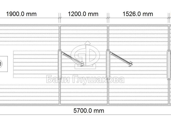Это базовая модель, на основе которой можно разработать индивидуальный заказ — поменять двери, размеры помещений, выбрать печь практически любой марки, заказать установку деревянных или стеклянных дверей, вагонку из кедра и пр.