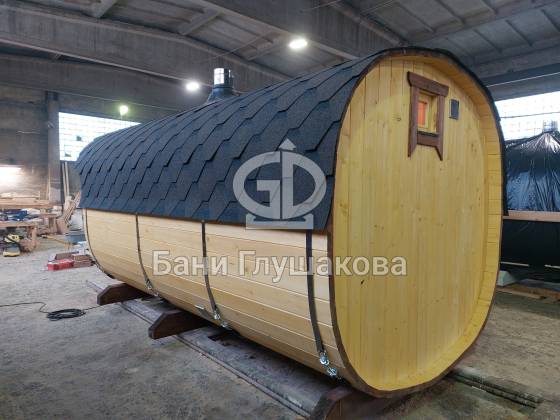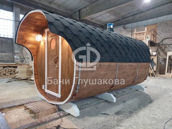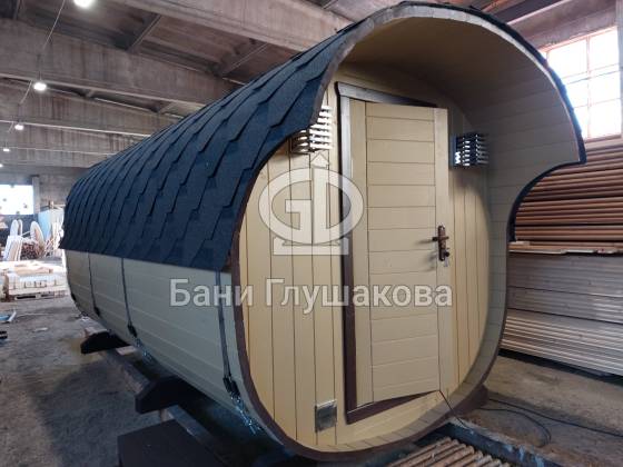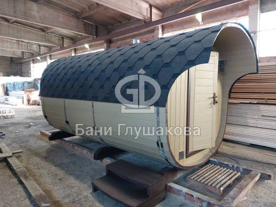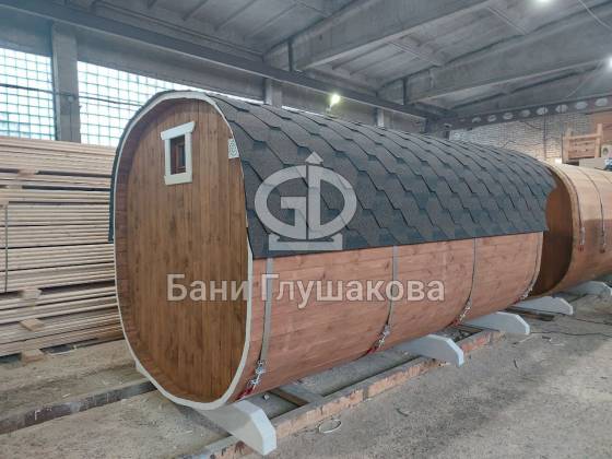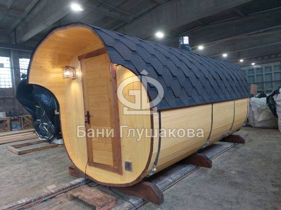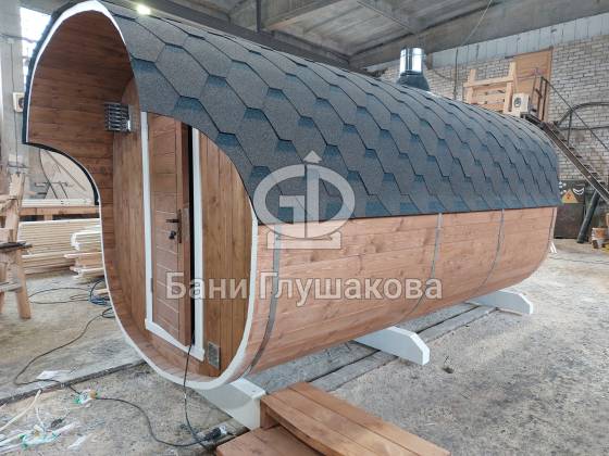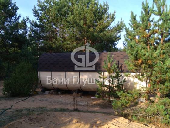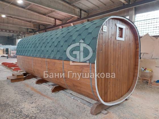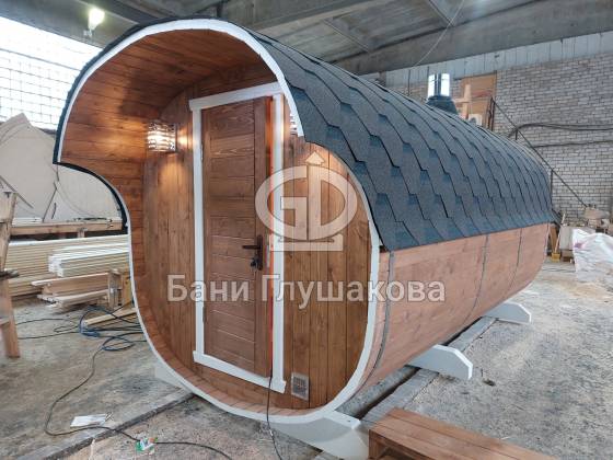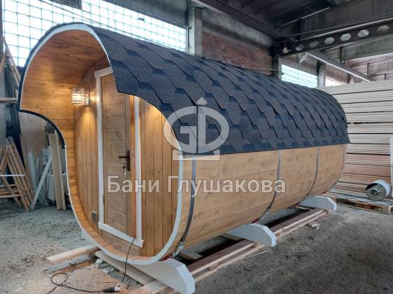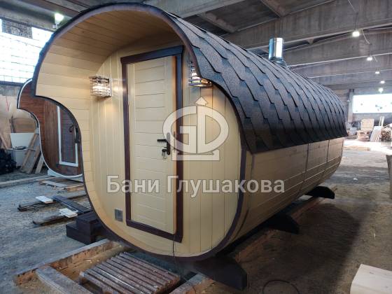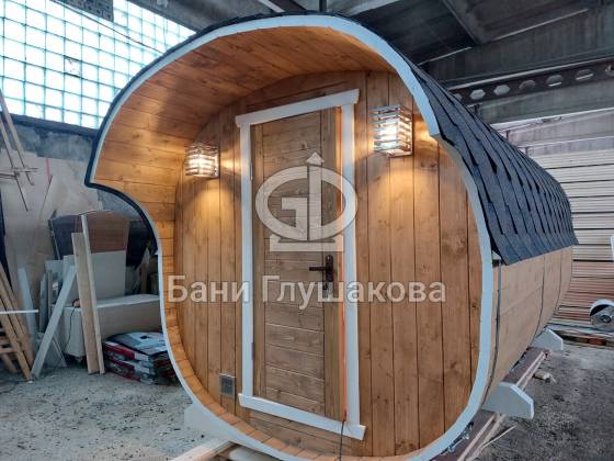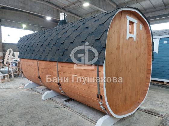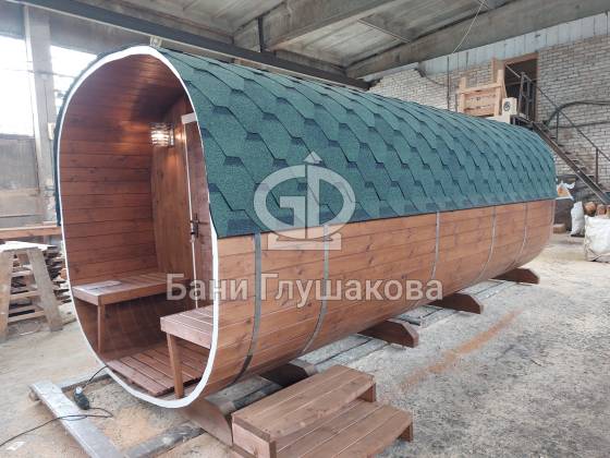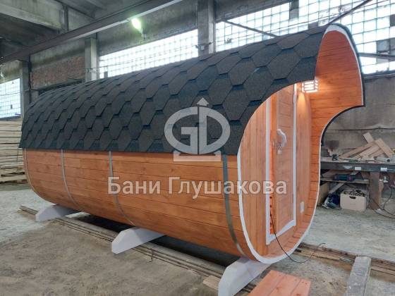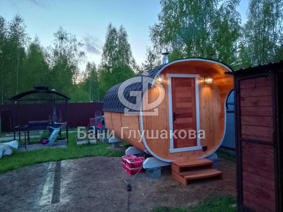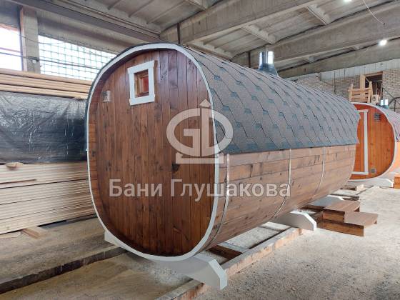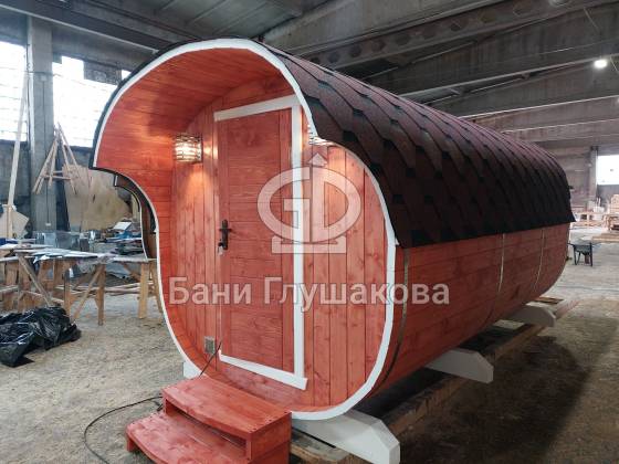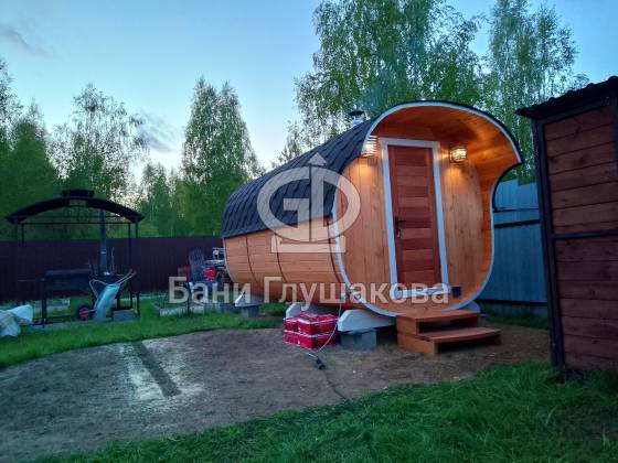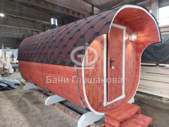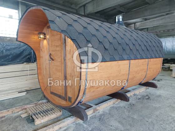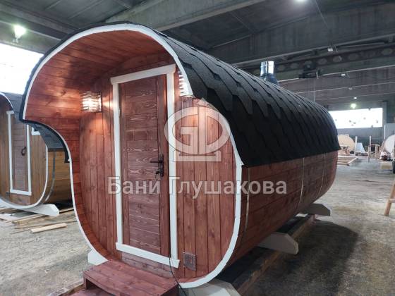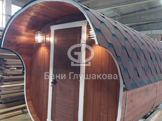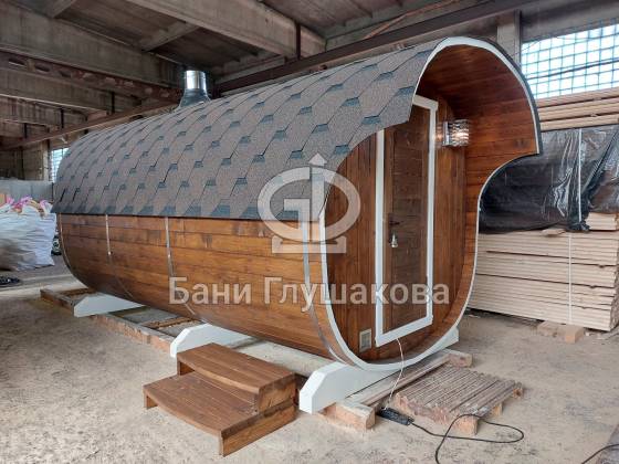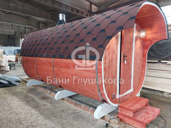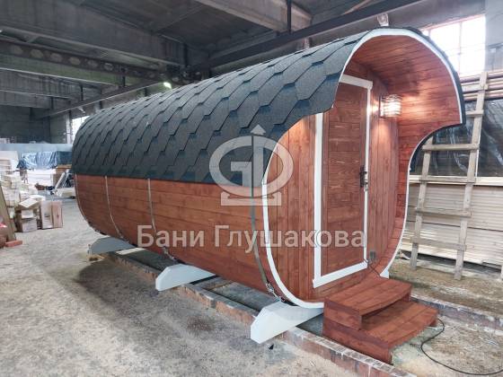 Модельный ряд довольно широк: варьируются и размеры, и дополнительные опции. Так можно заказать квадратную баню бочку с козырьком, террасой, душевой кабинкой, выносной топкой, дровяником — реализуем любые адекватные идеи. Также есть вариант строительства из кедра.