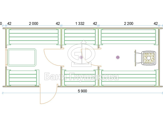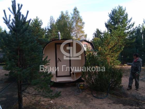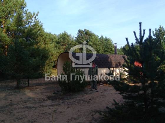 На участок баня привозится в уже собранном виде с полной отделкой под ключ — с печью, дверями, душем и пр. Установка занимает пару часов, после чего можно начинать топить.