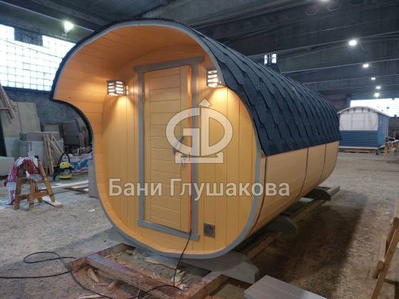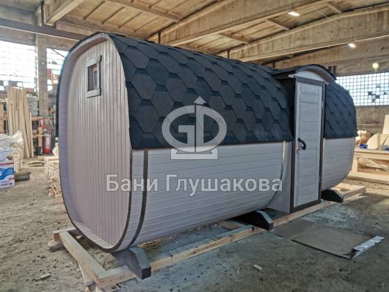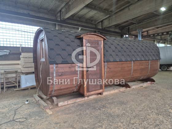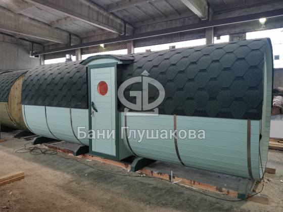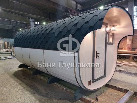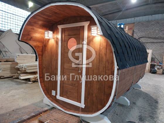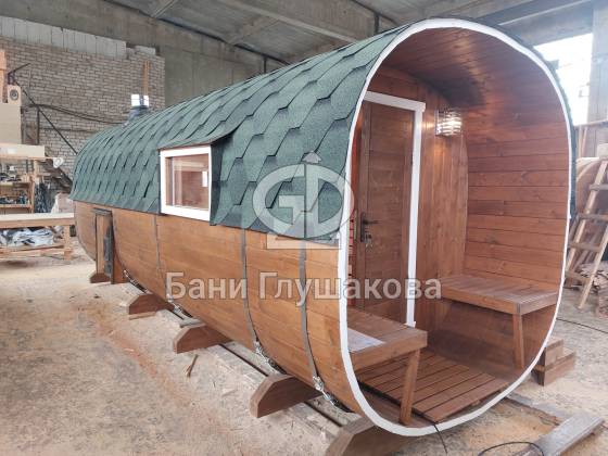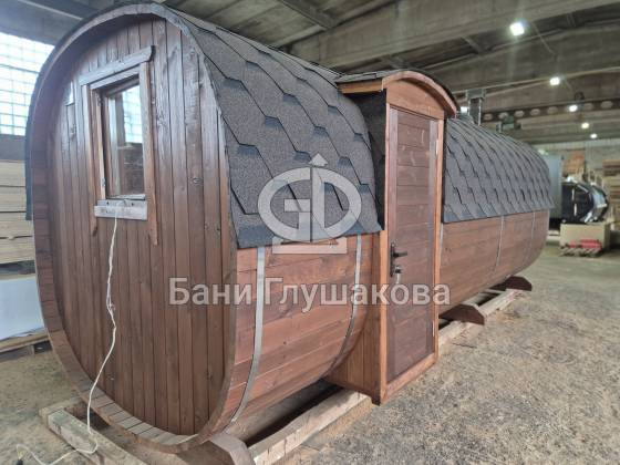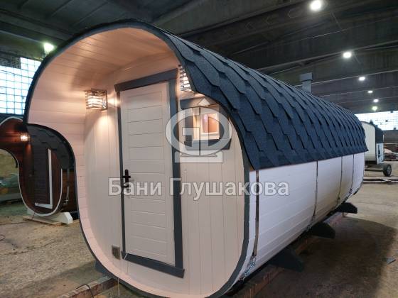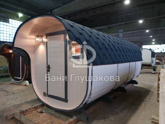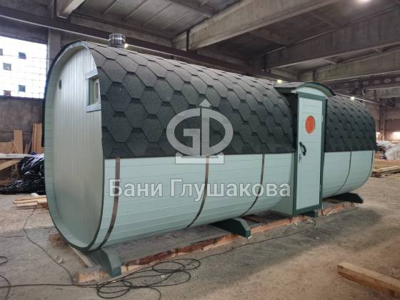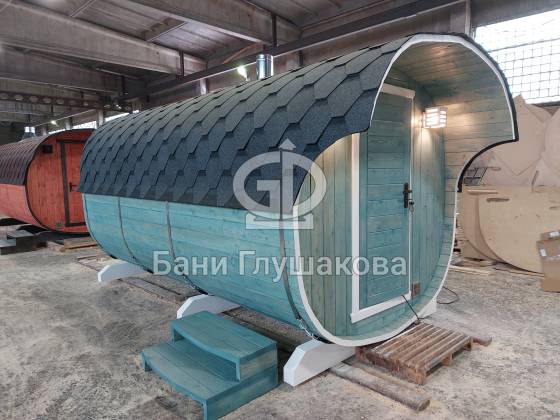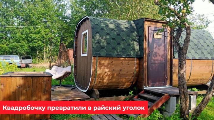 Перевозная квадробочка совмещает в себе классическую баню в виде бытовку с оригинальной круглой баней бочкой. С одной стороны конфигурация более привычная, а с другой — необычный дизайн.