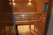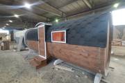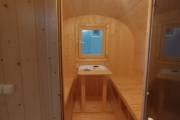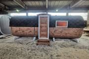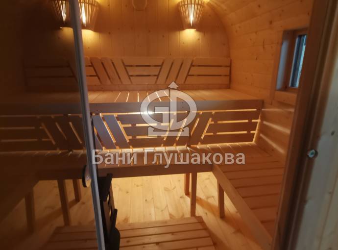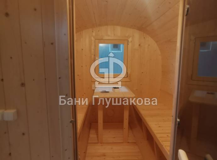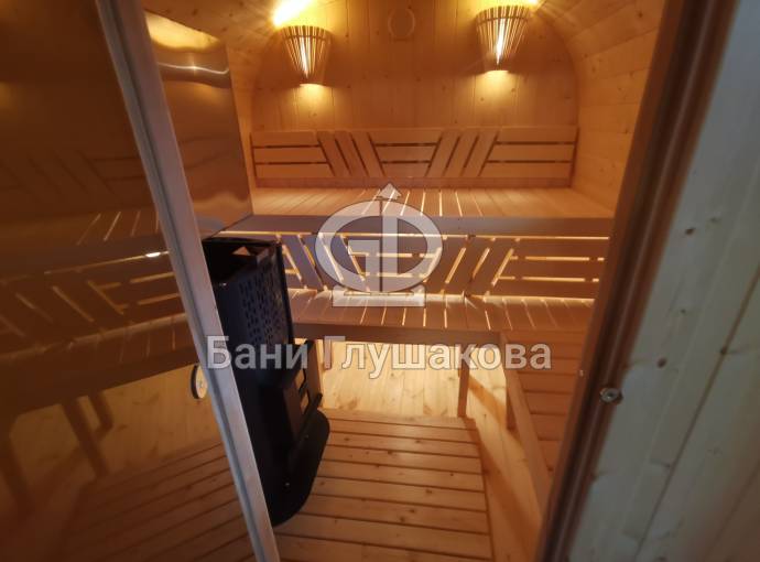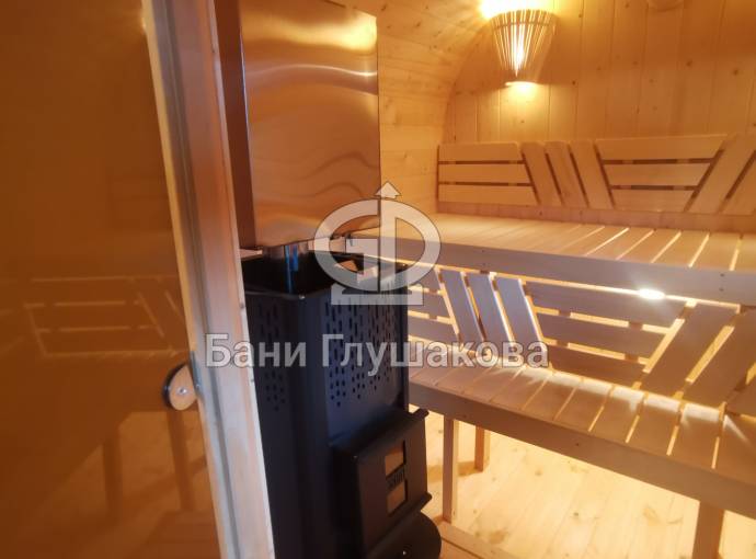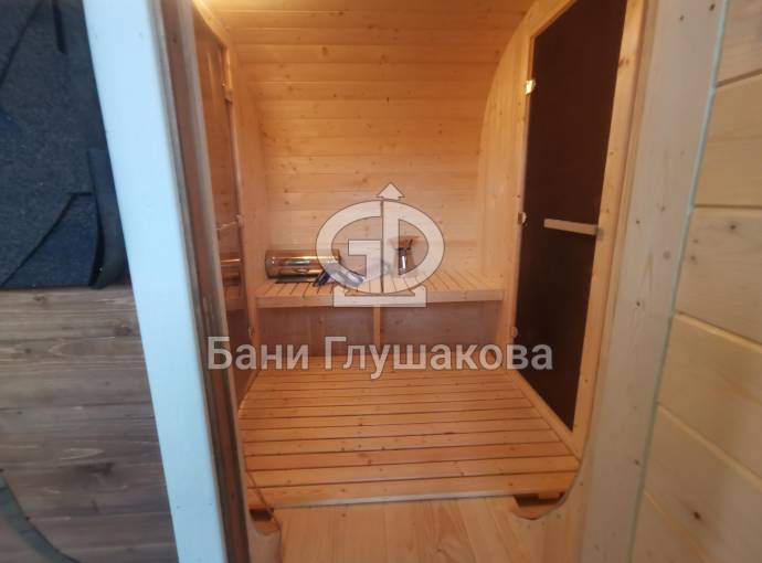 Квадратная баня бочка с центральным входом — парная справа.